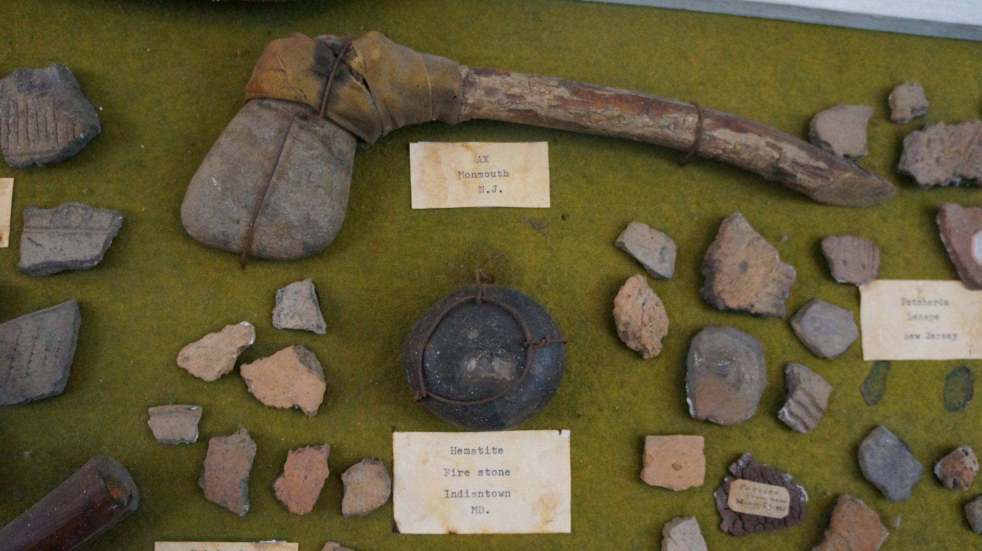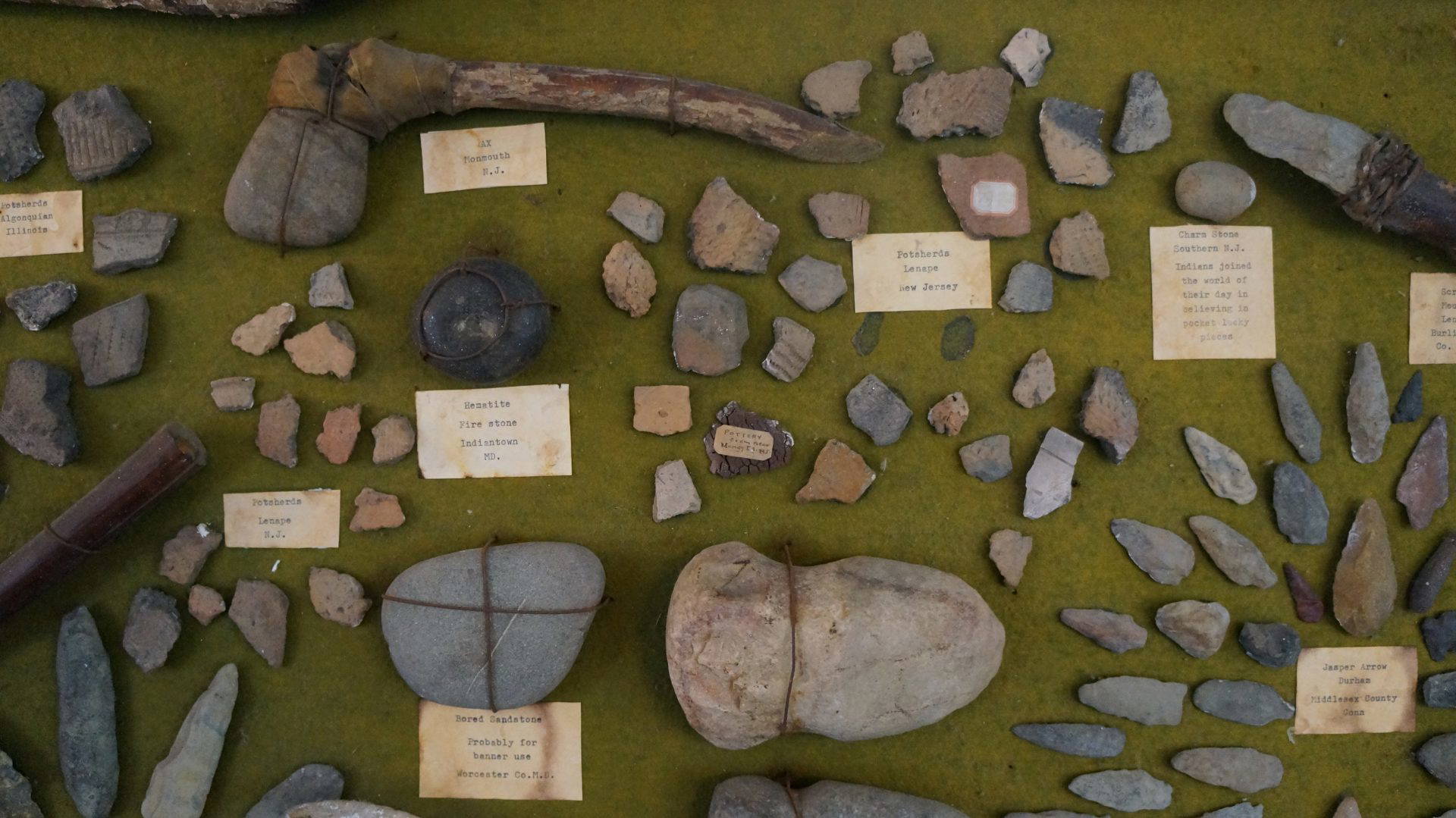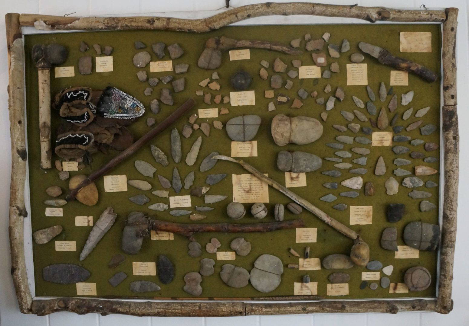 222. A collection of historic and prehistoric artefacts from the U.S.A. Purported to have been in a public schools private museum. Including ancient axe heads and arrow points, hafted axes, a lovely little pigment dish and grinder, etc. Whomever composed the descriptions must have had an extensive knowledge in lithic objects from America.