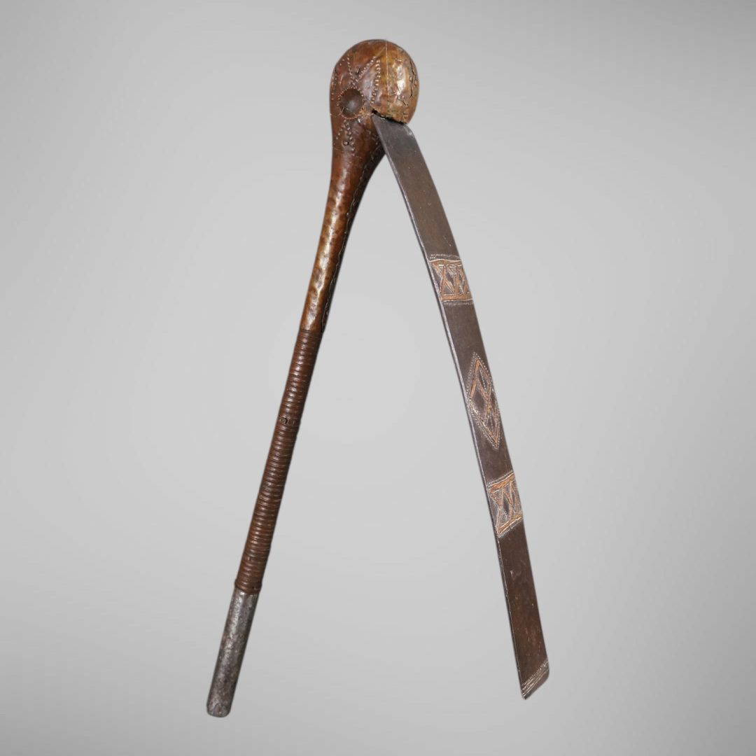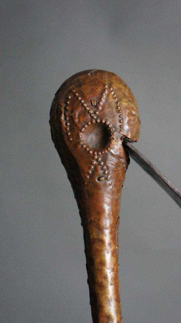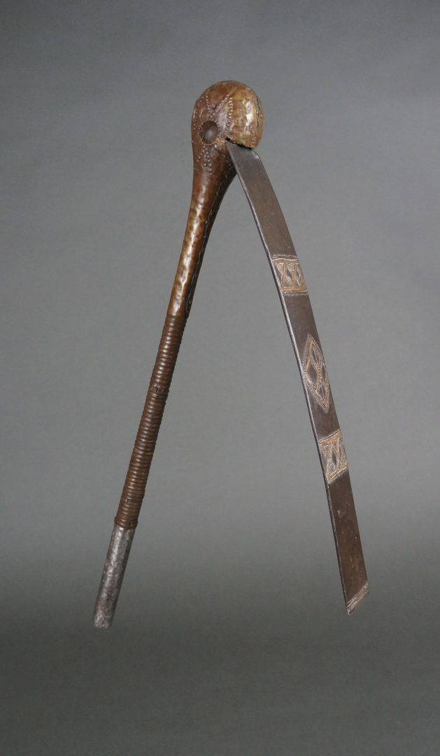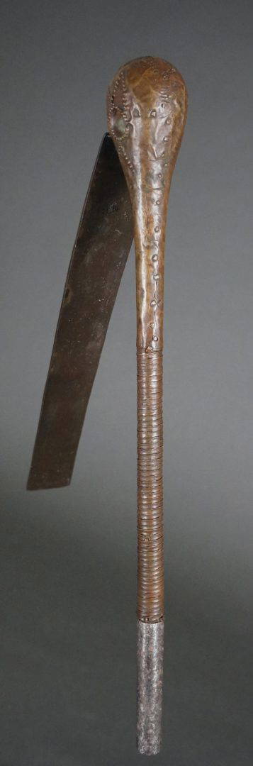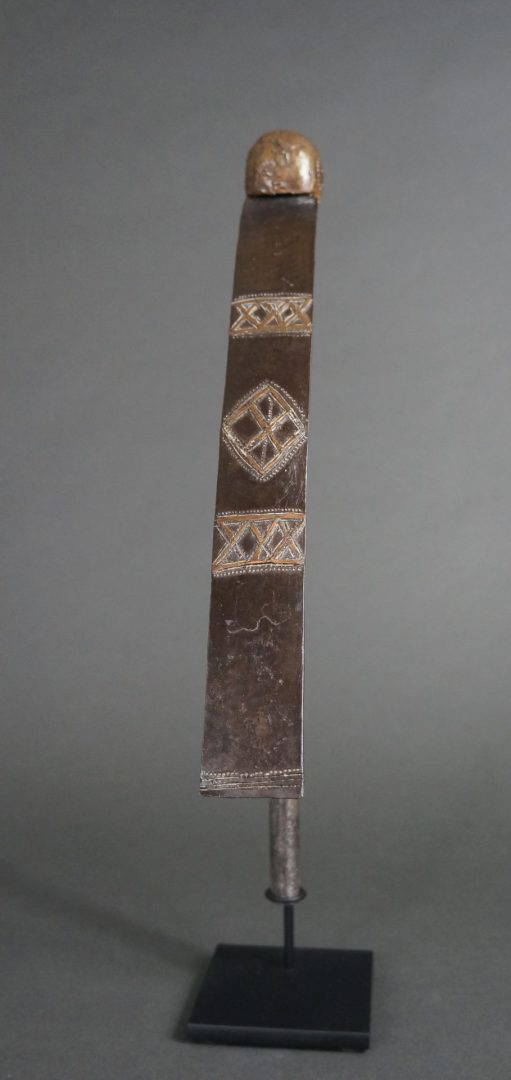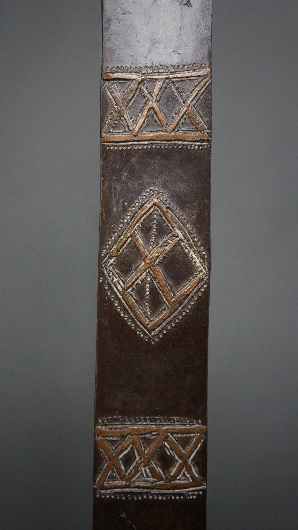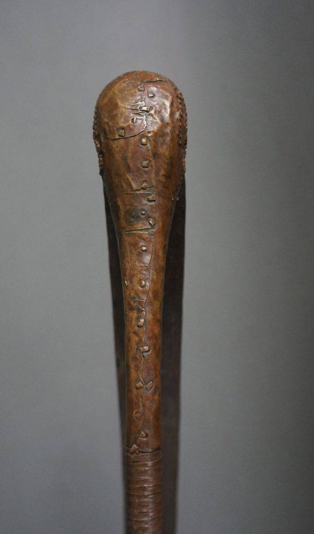 170. Ceremonial adze, wrapped in copper with an overlaid, decorated blade. Early 20th century. This comes with a very well made, custom stand.
