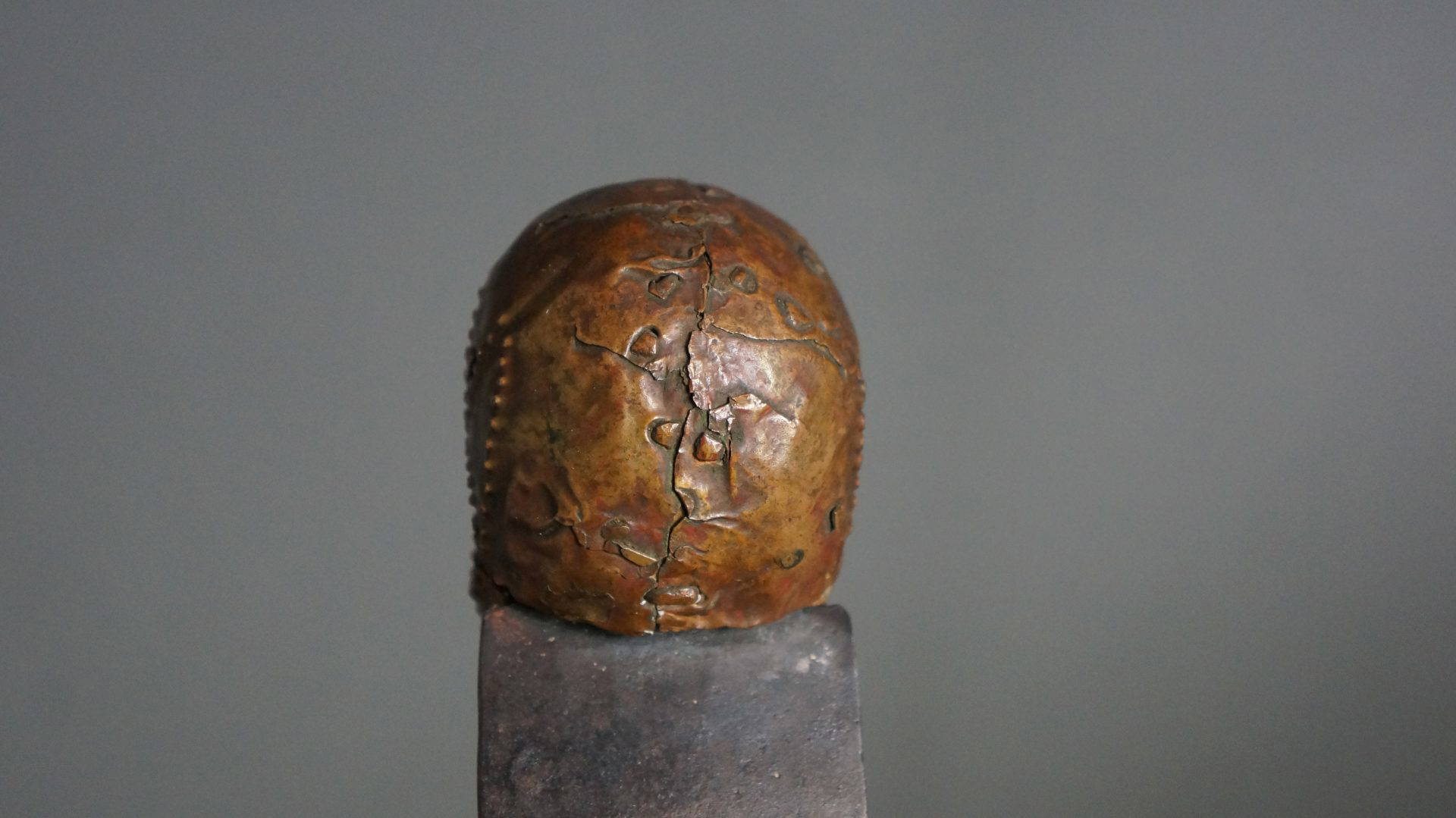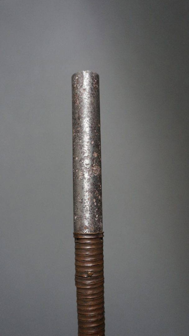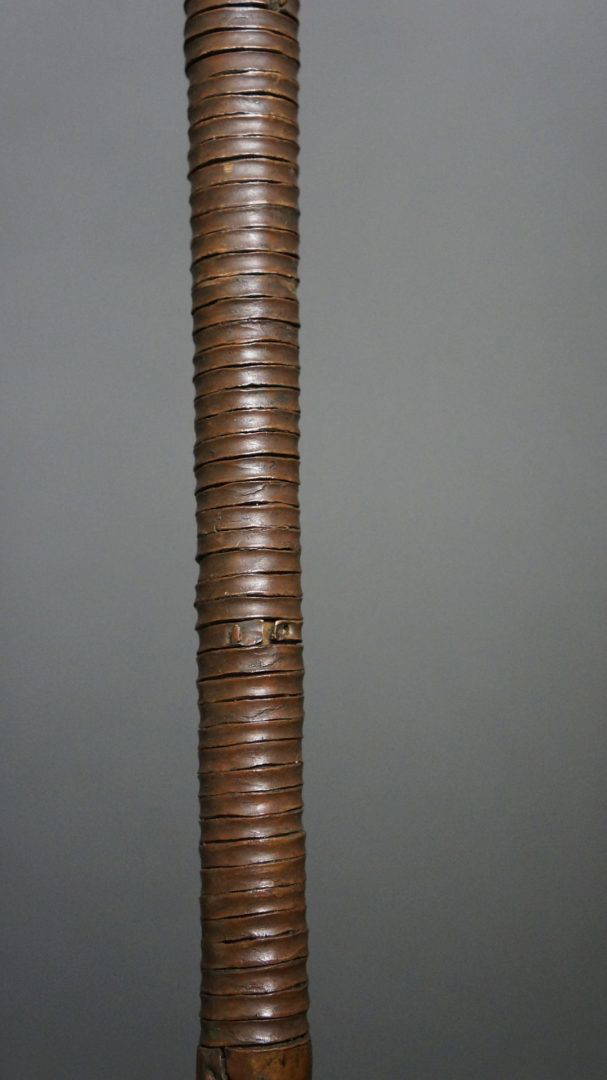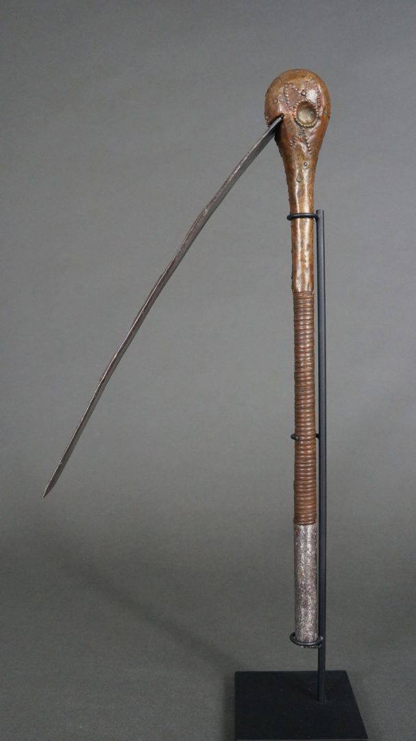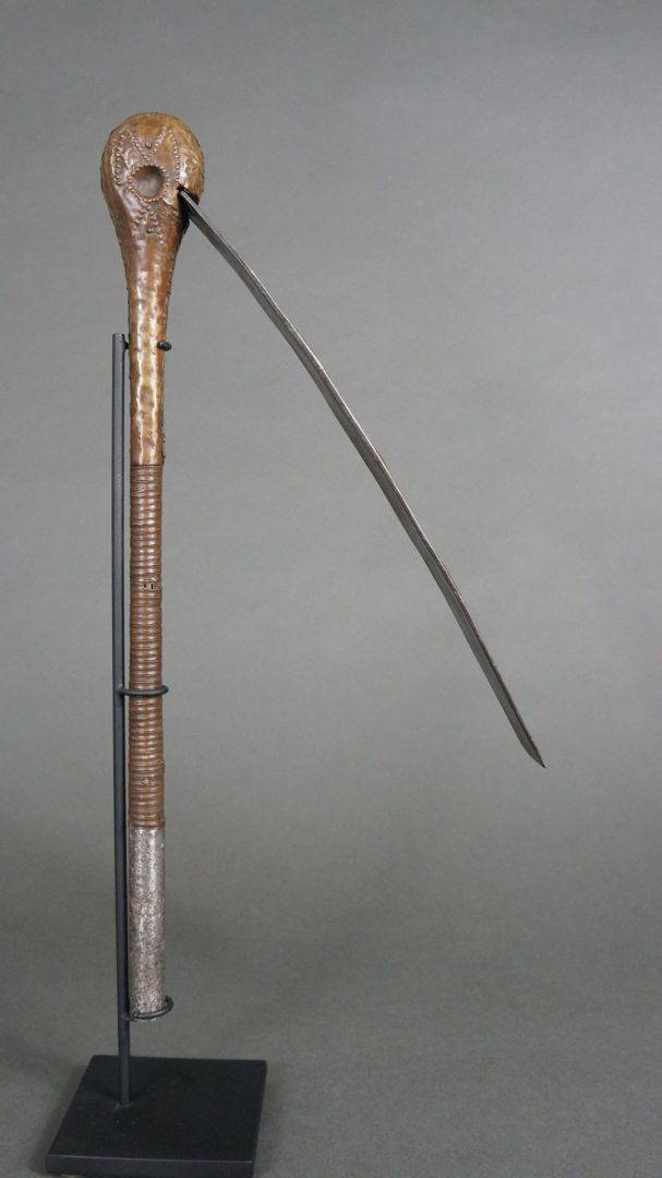 170. Ceremonial adze, wrapped in copper with an overlaid, decorated blade. Early 20th century. This comes with a very well made, custom stand.