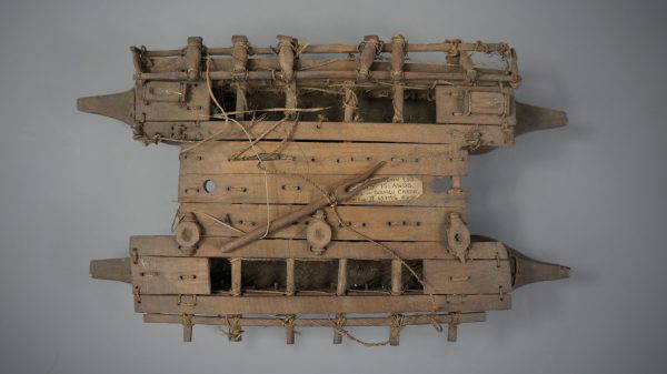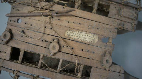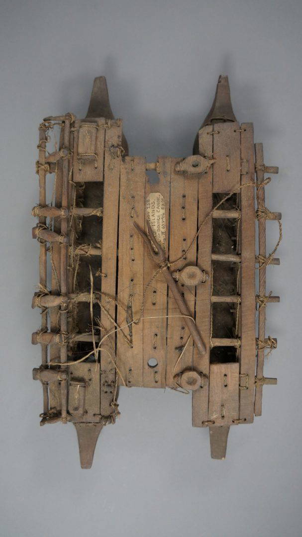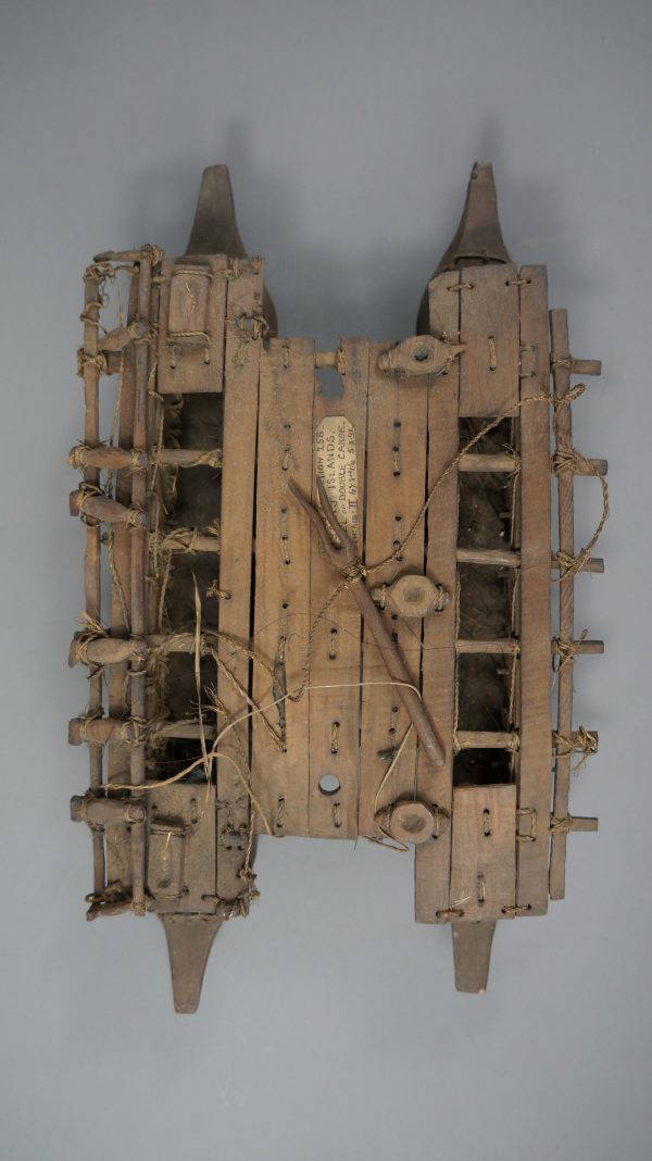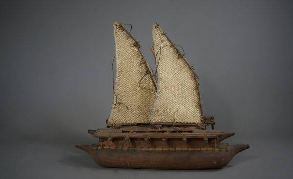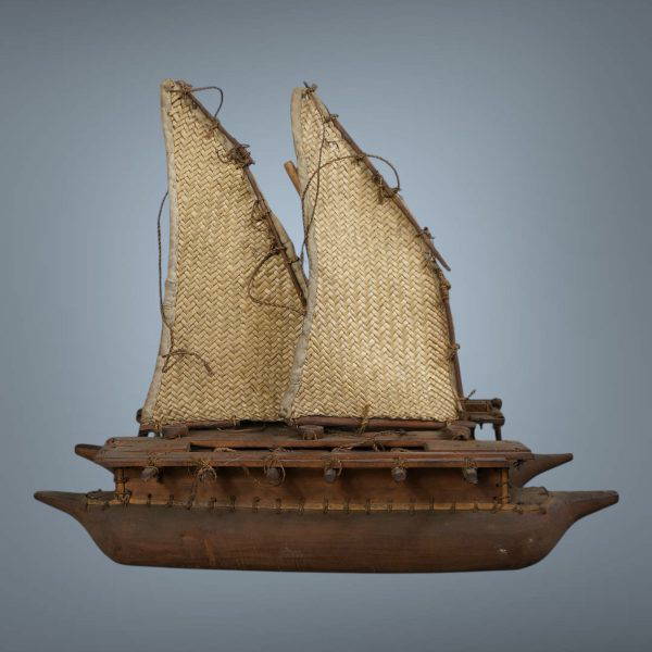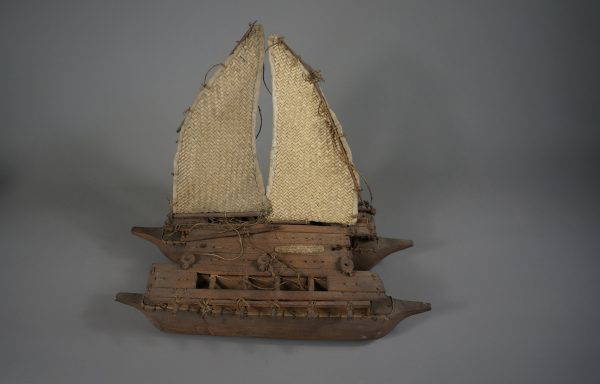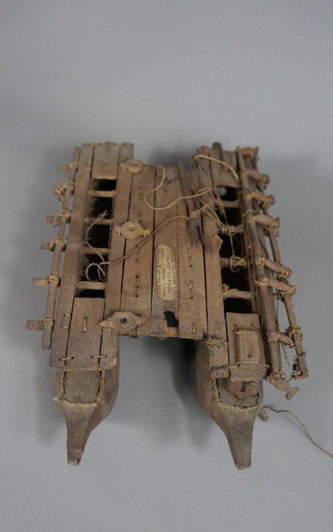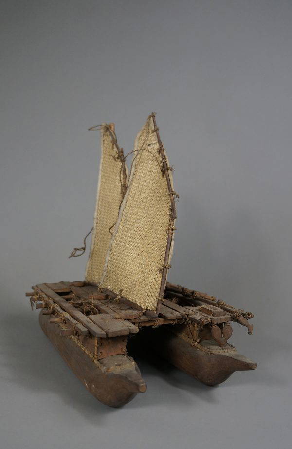 the double hulls united by boards and fibre, with a pair of woven rattan and cloth edged sails, with a paper label inscribed KENNEDY COLLECTION 258. LOYALTY ISLANDS. MODEL OF DOUBLE CANOE. ETH:ALB:II 67.Nos 1/4 5.X.91.,