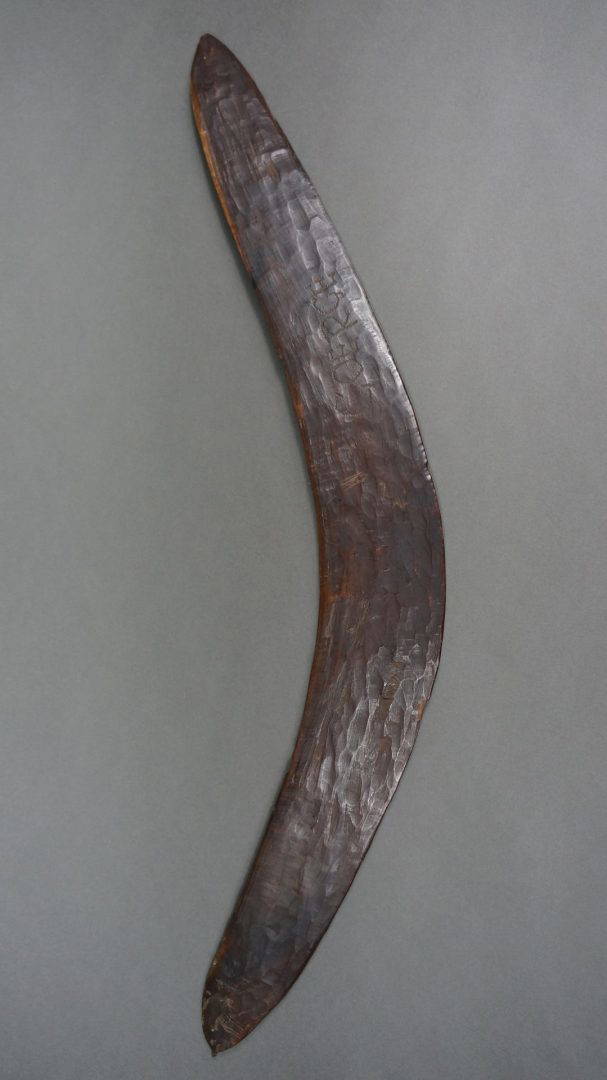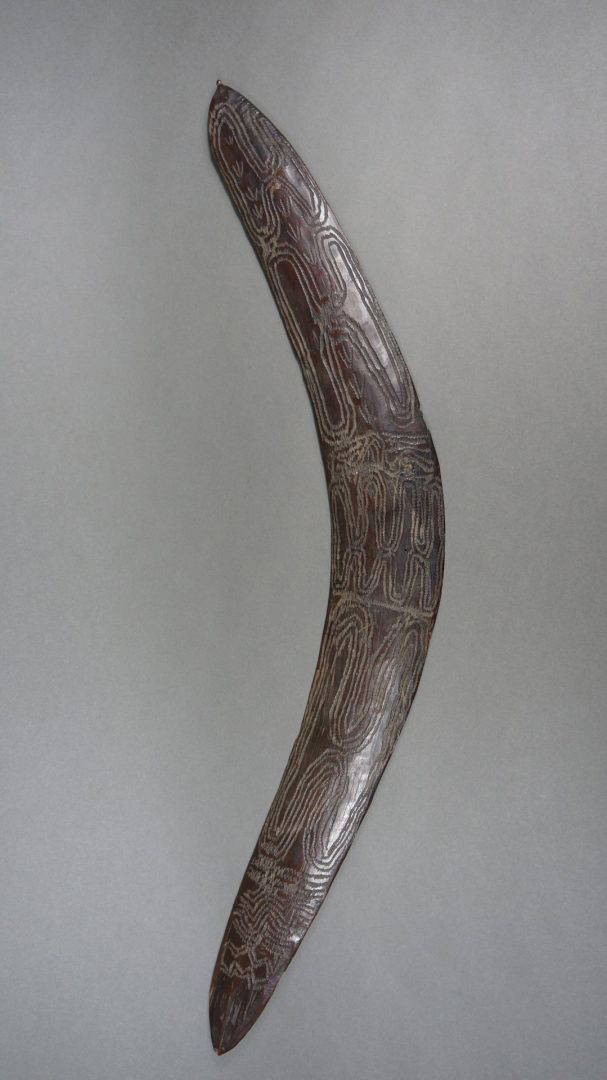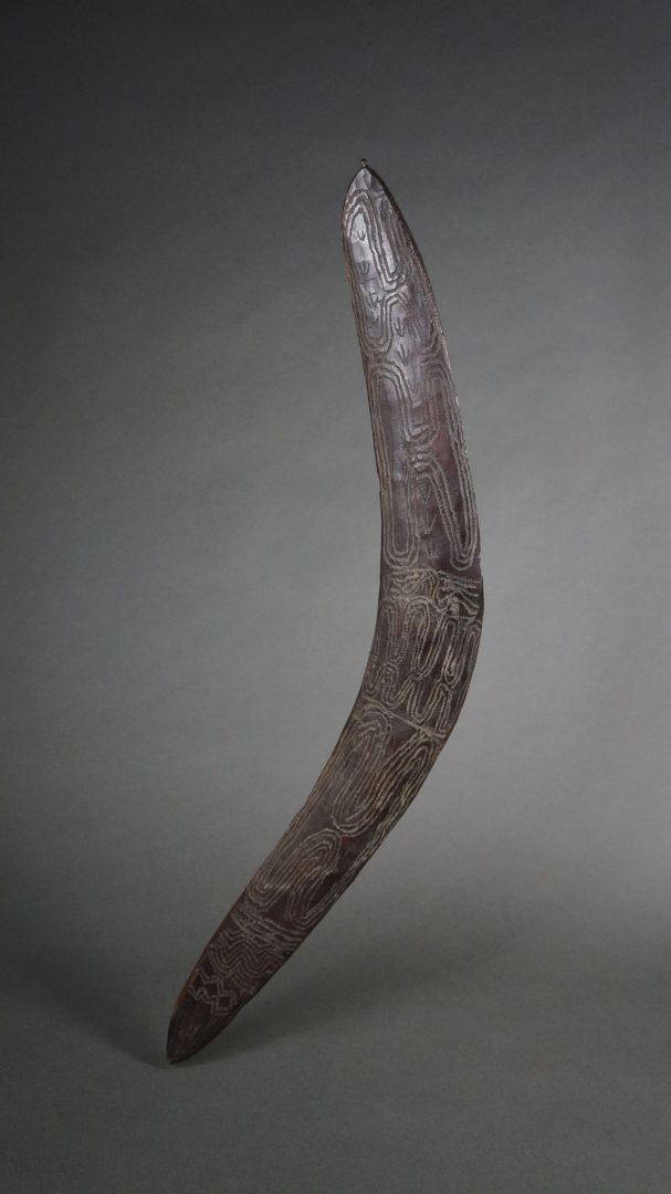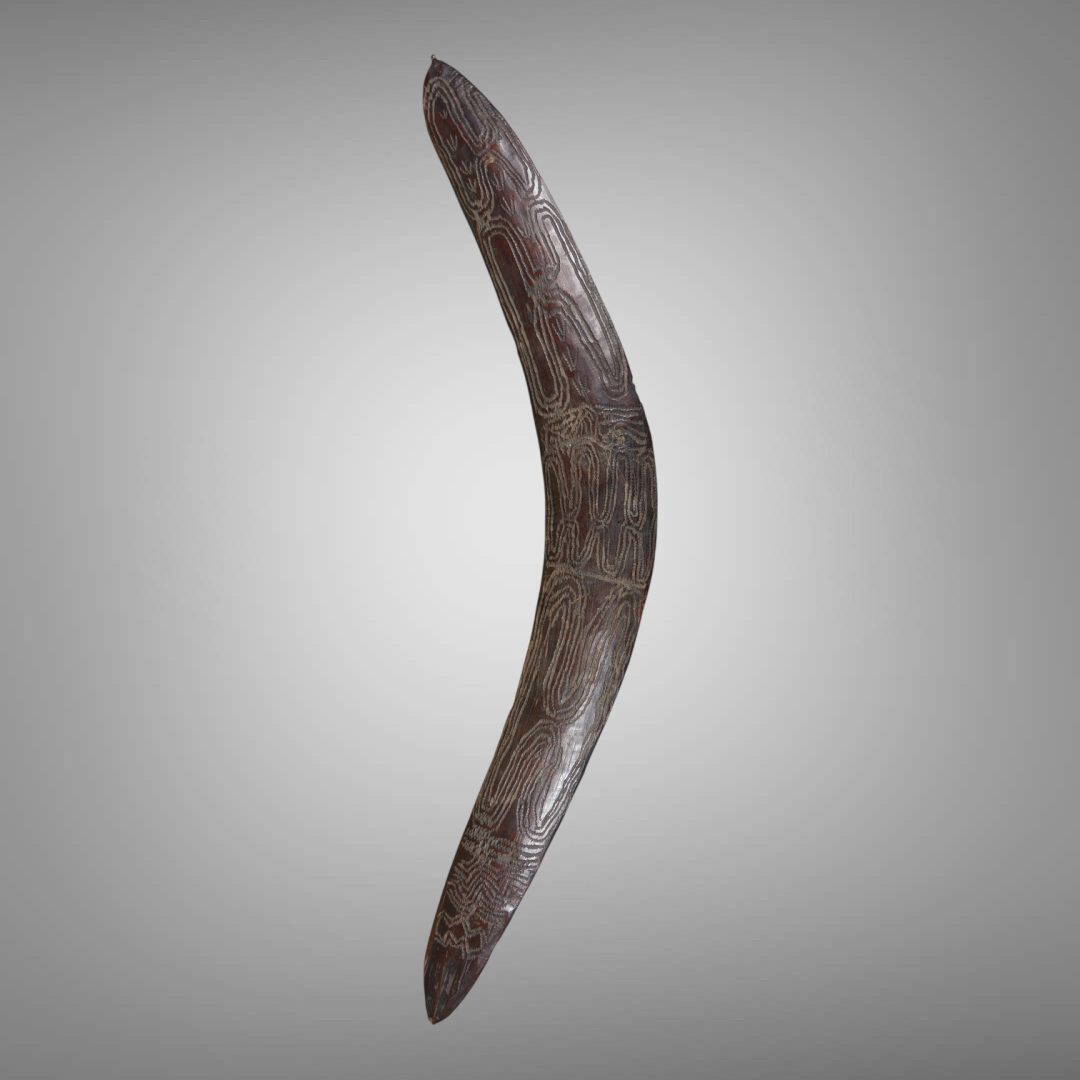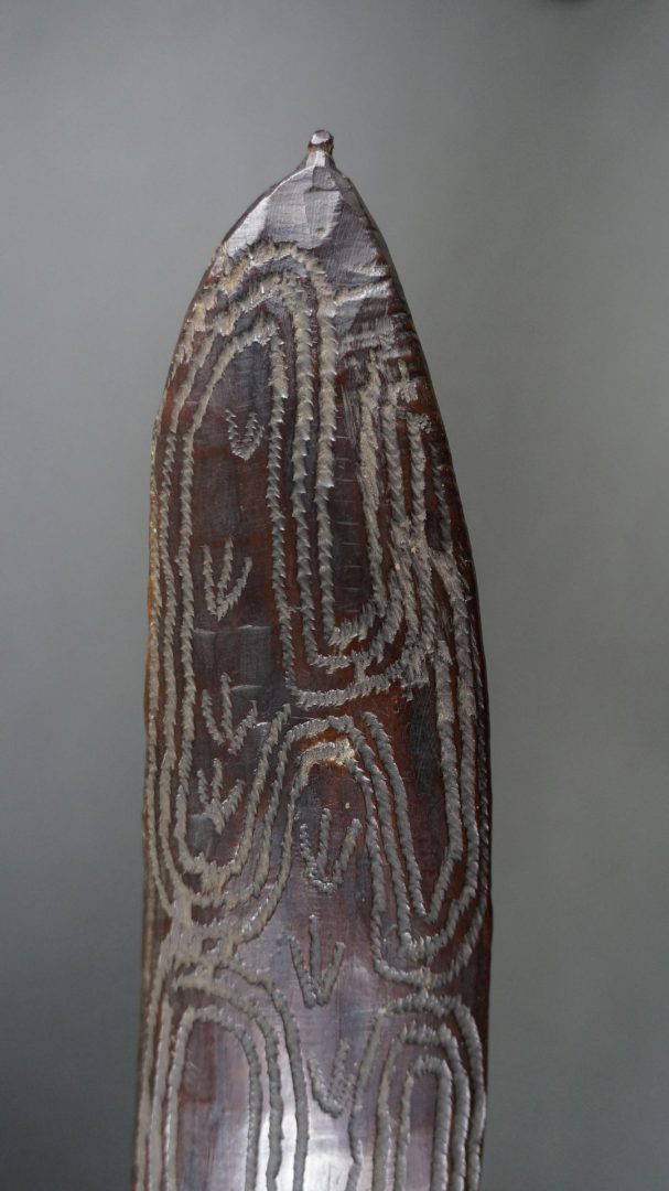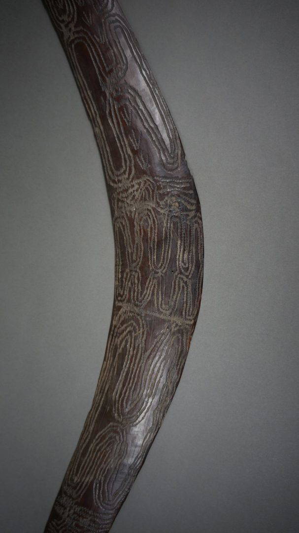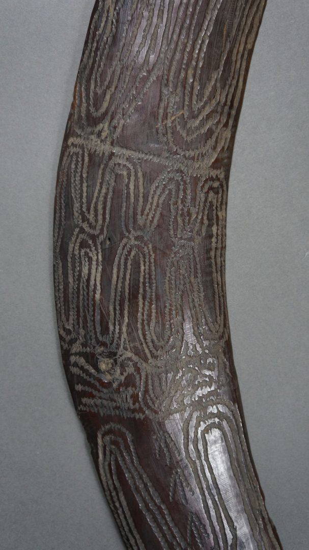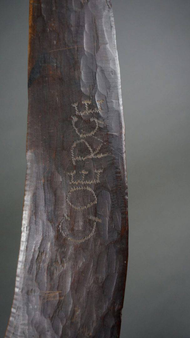 134. 19th century, profusely decorated in a meandering design with tracks, rich dark patina. The carver has signed the back ‘GOERGE’