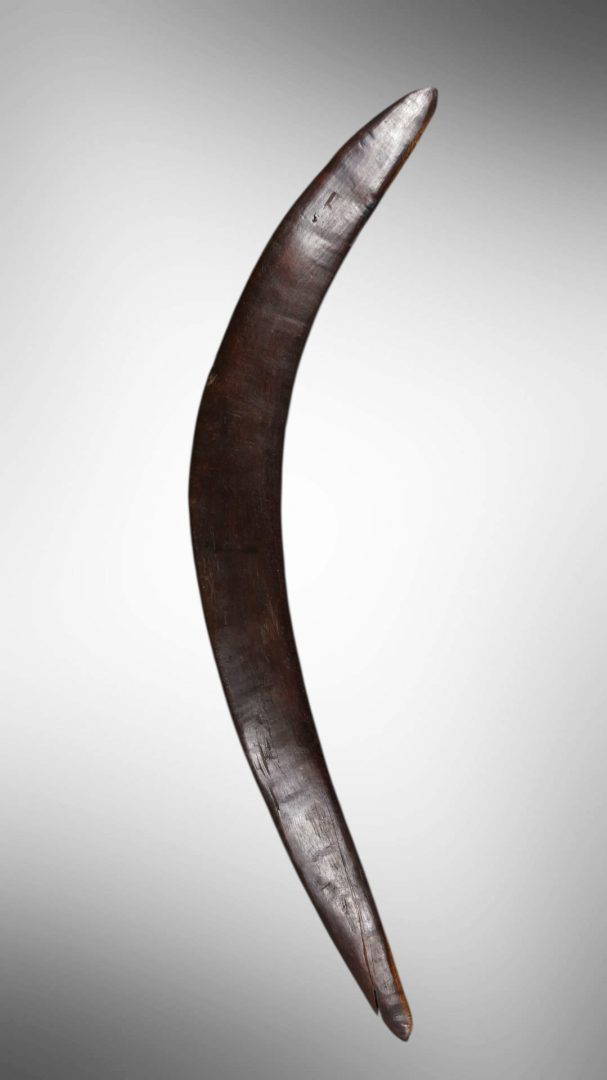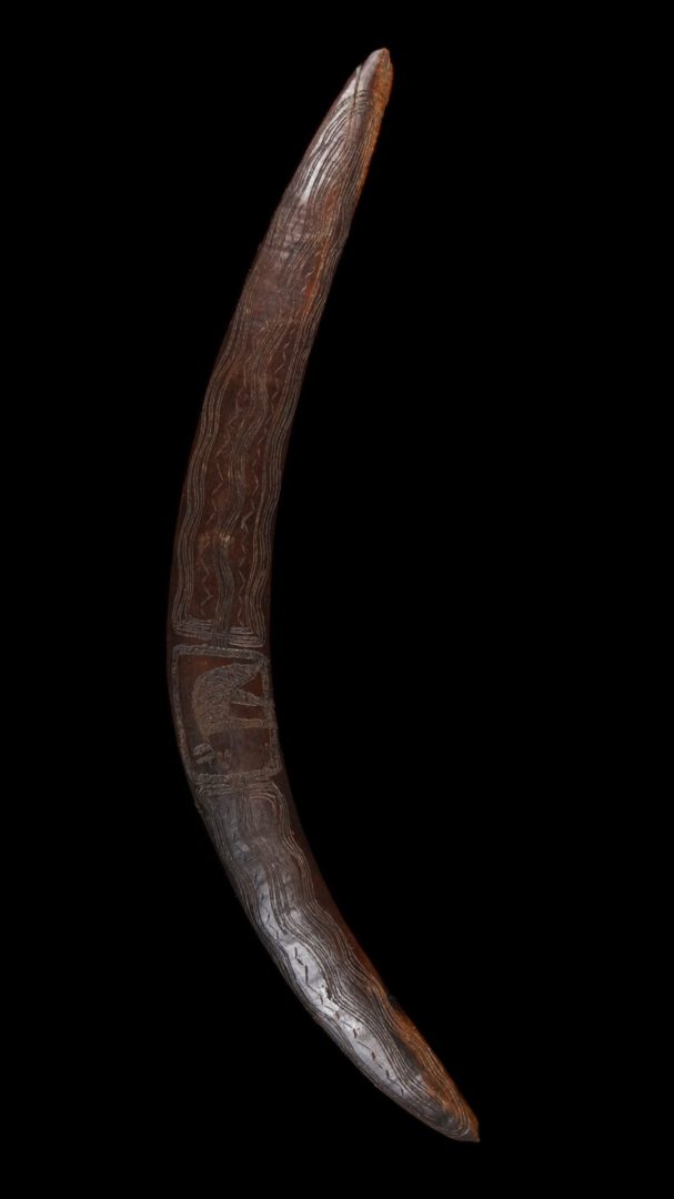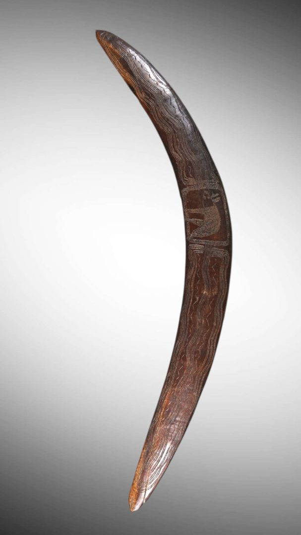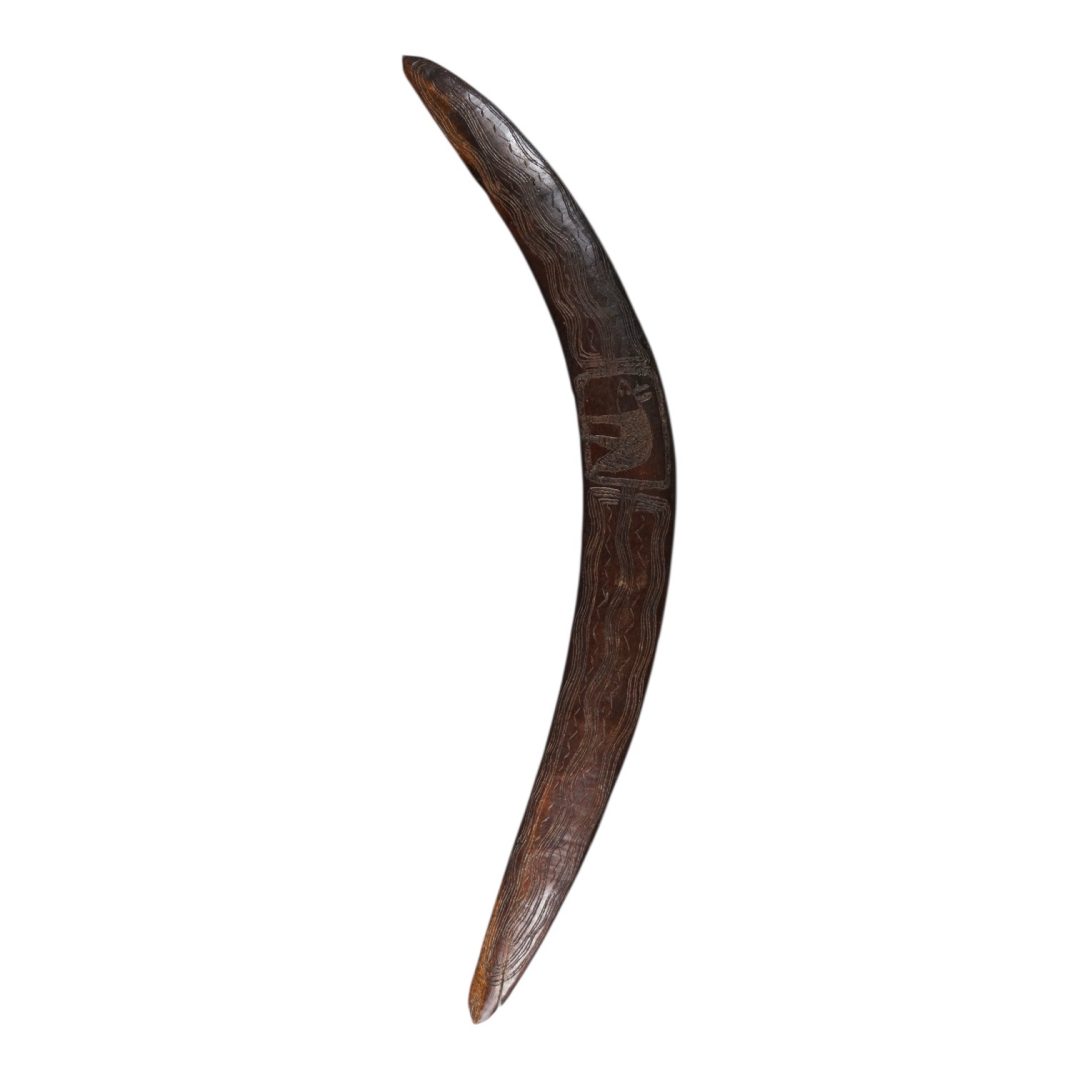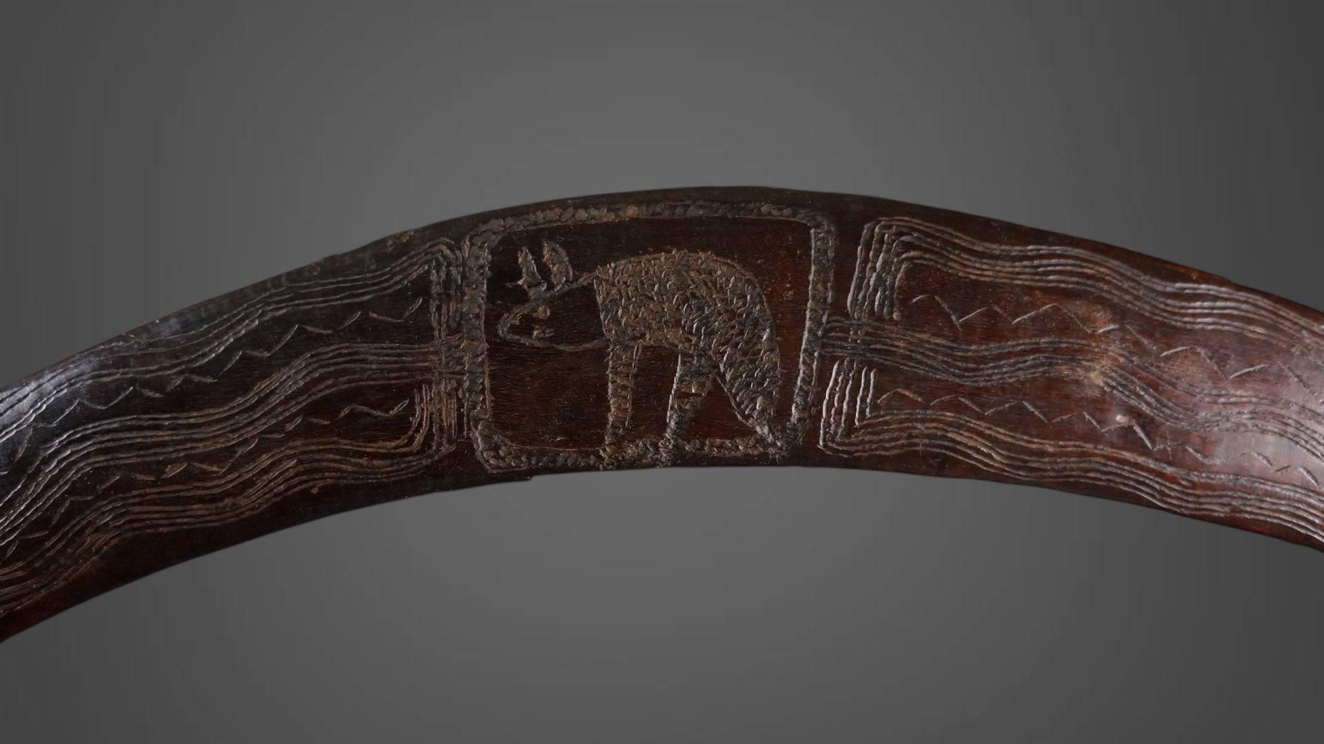 202. A rare 19th century boomerang with a depiction of an animal carved into the central section. 19th century.