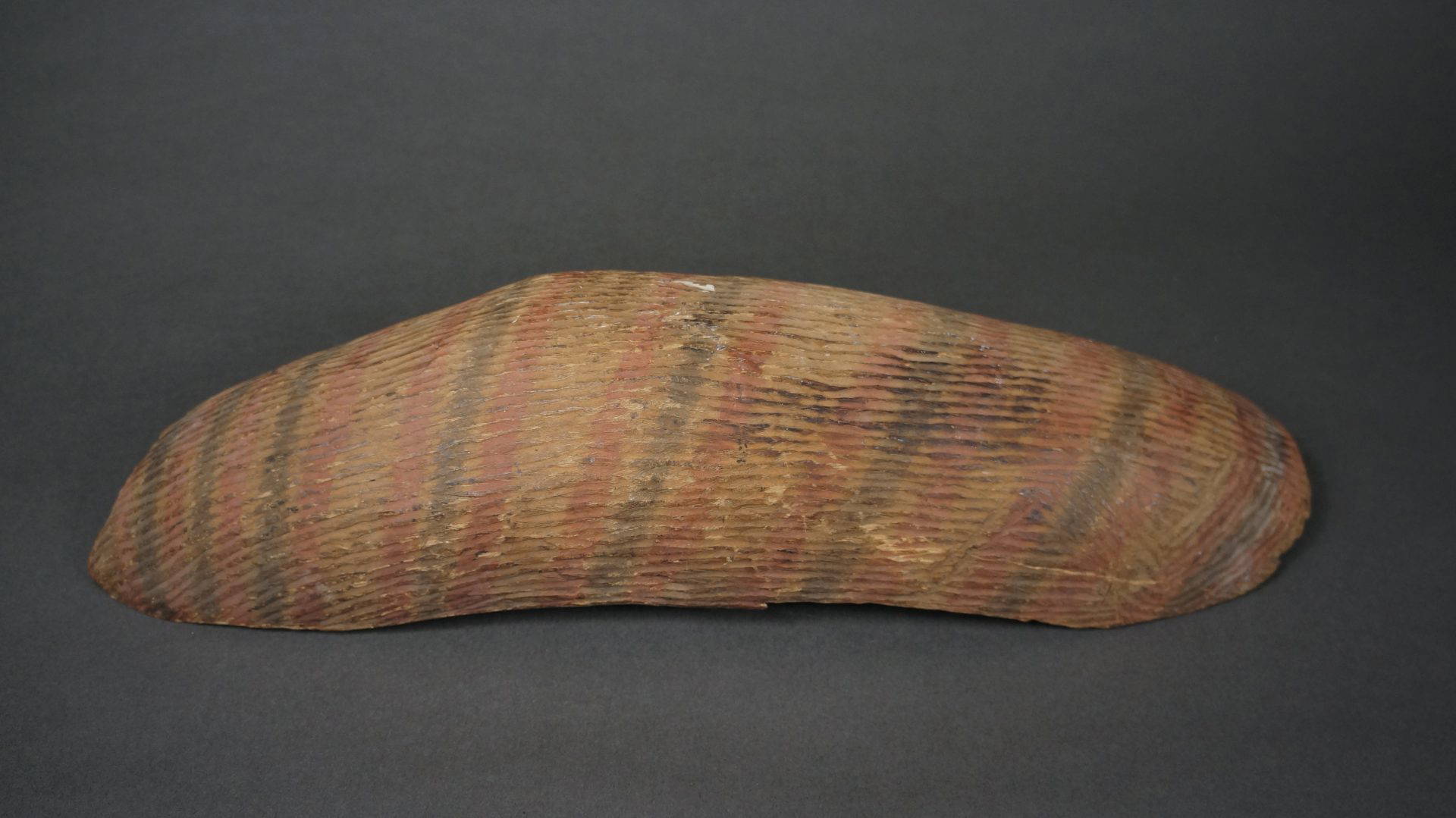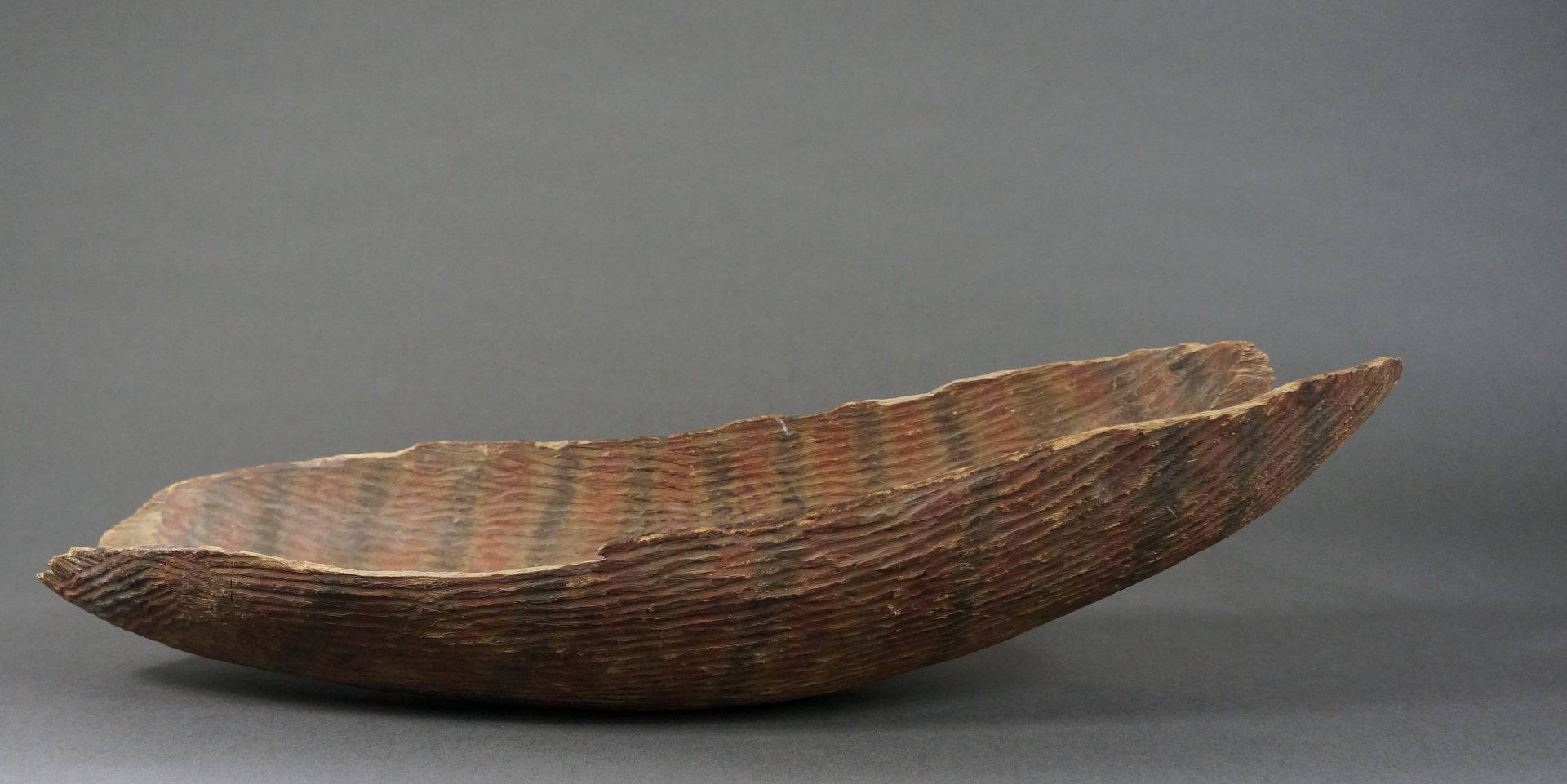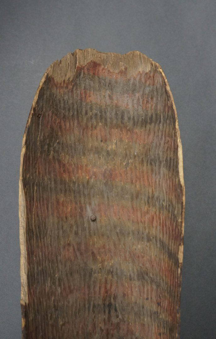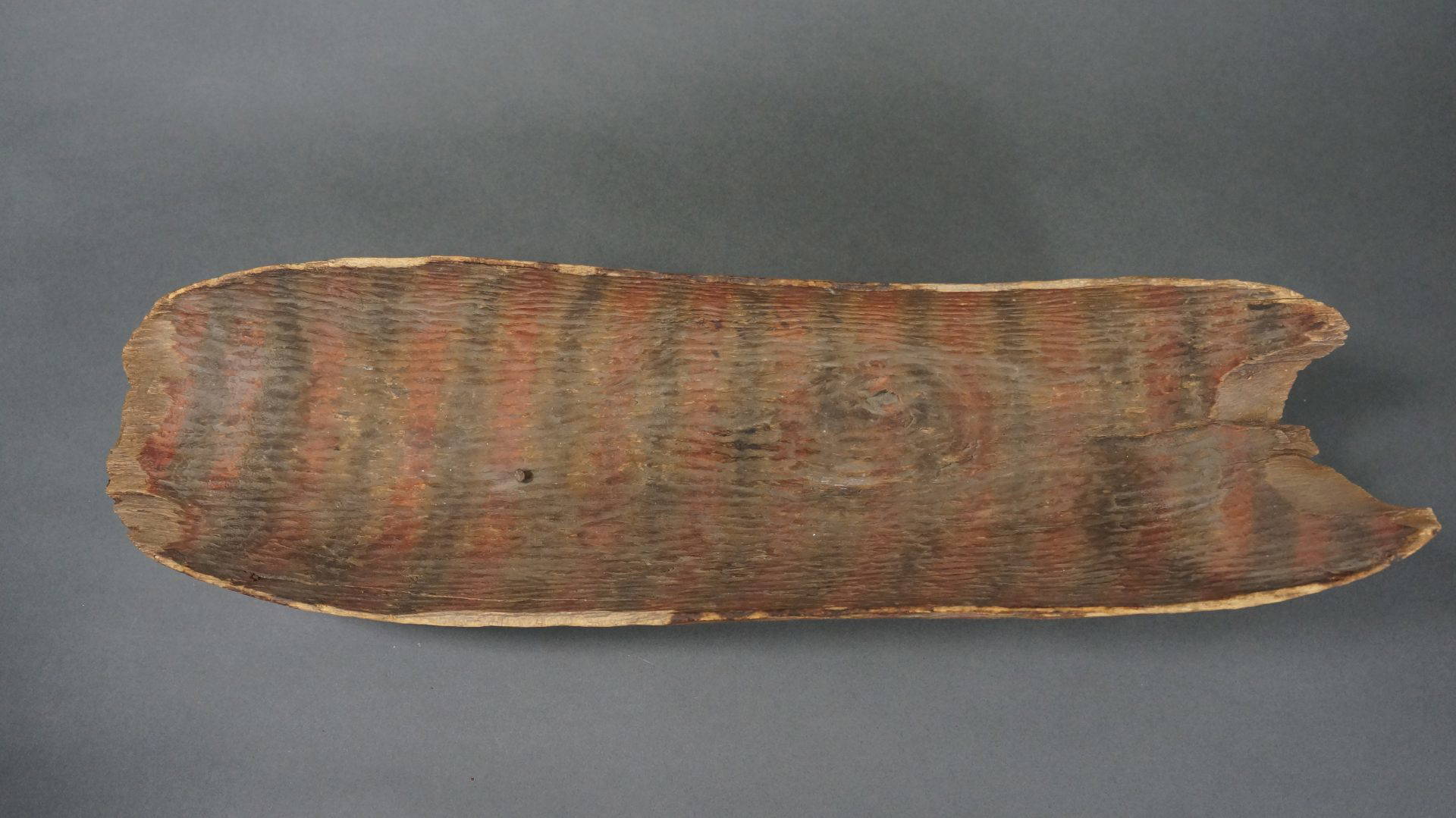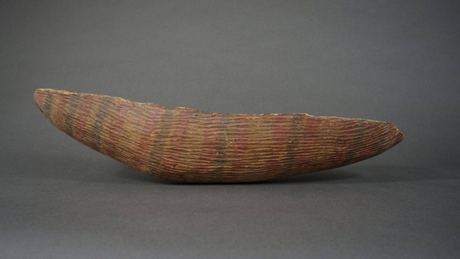 149. A fluted and painted coolamon dating to around 1900. Some old damage.