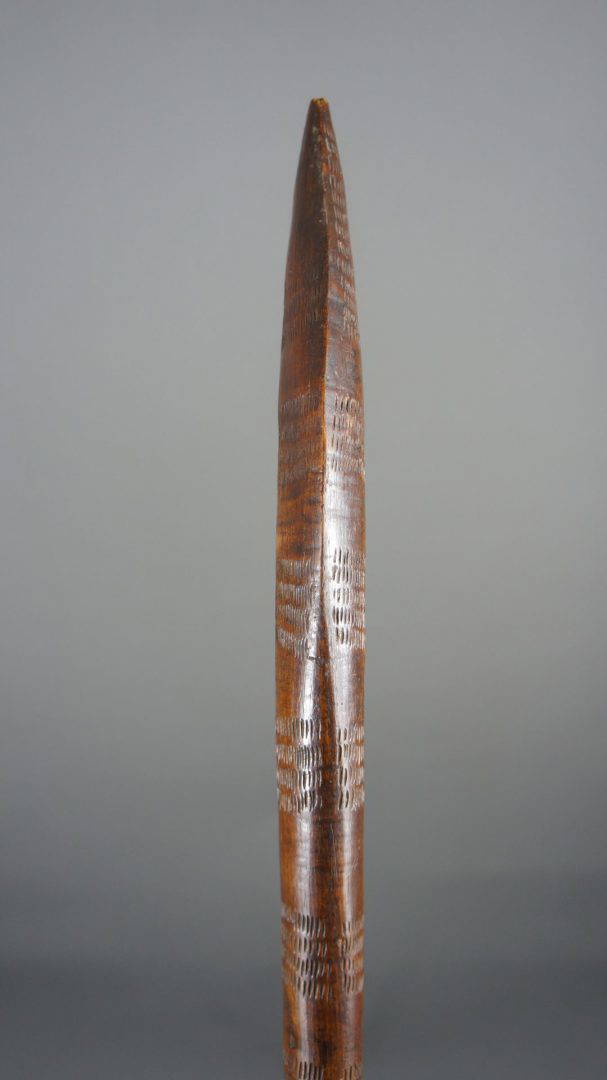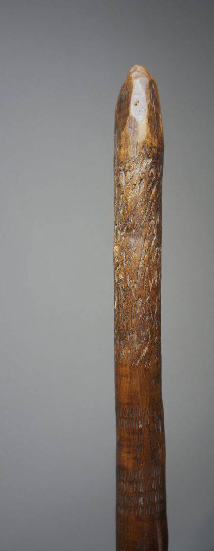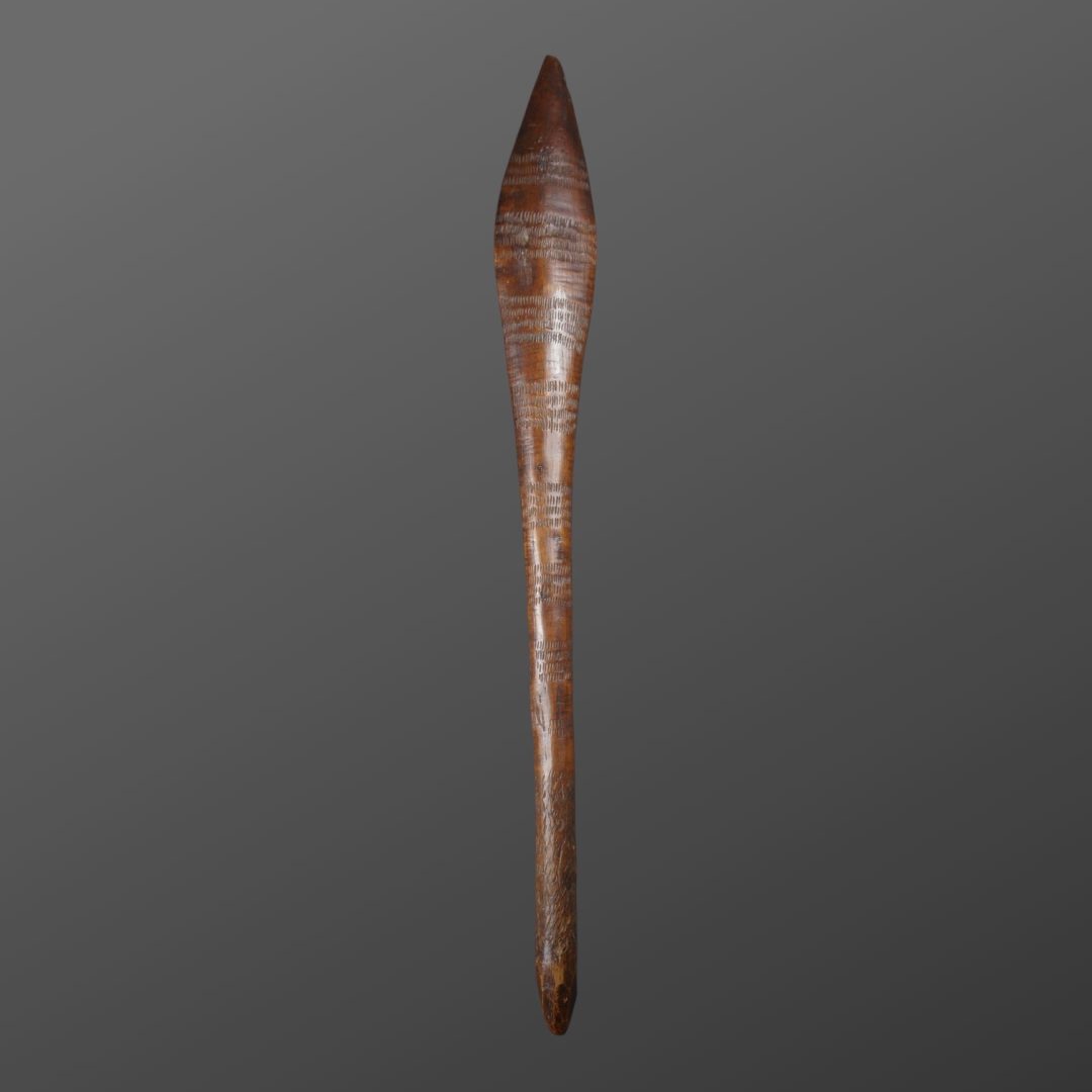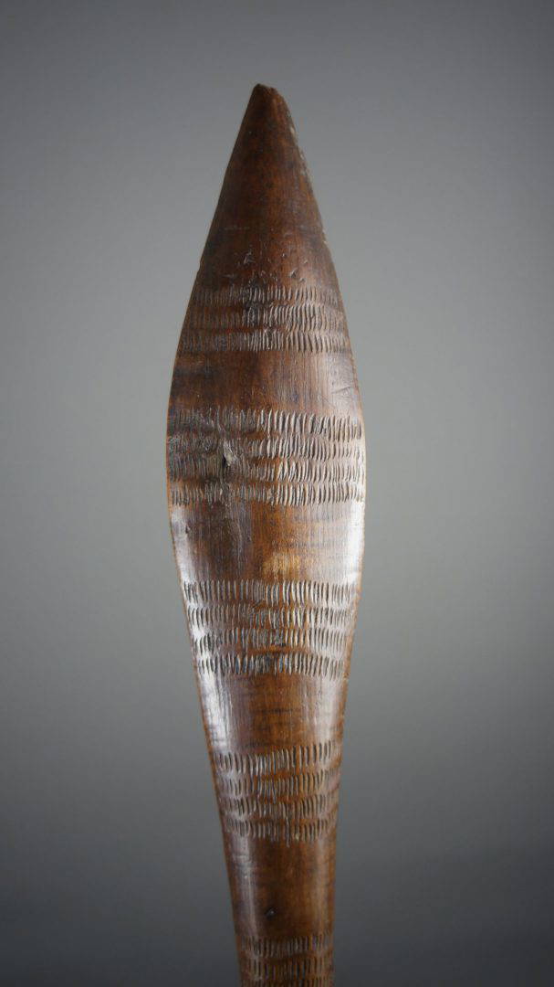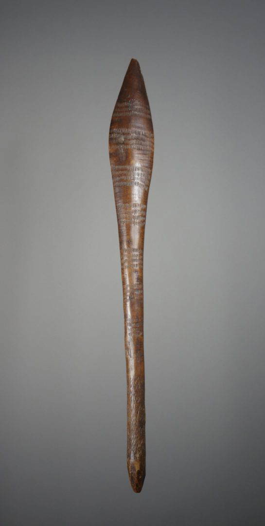 11. A 19th century Aboriginal club with ‘regiments’ of finely pecked lines. Great patina and a used surface. Remains of an old label.