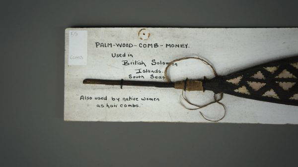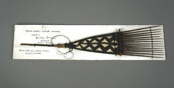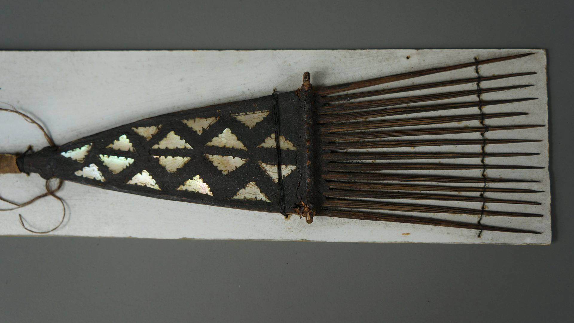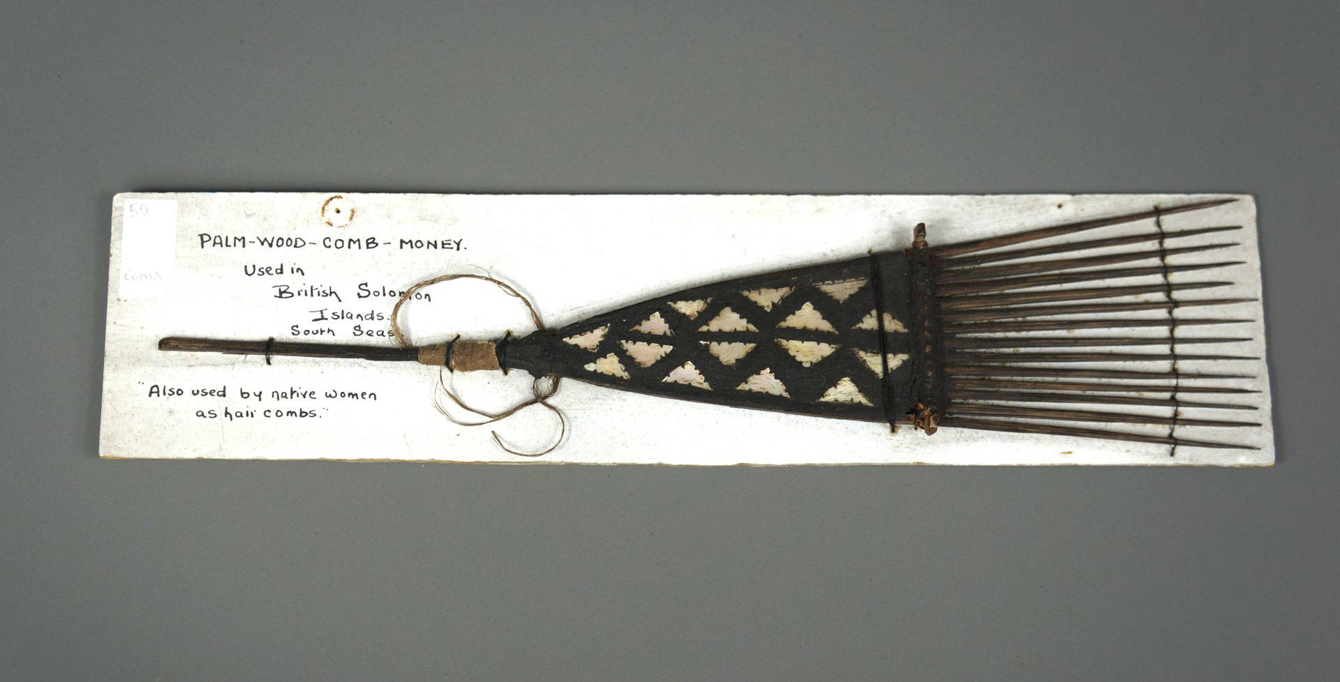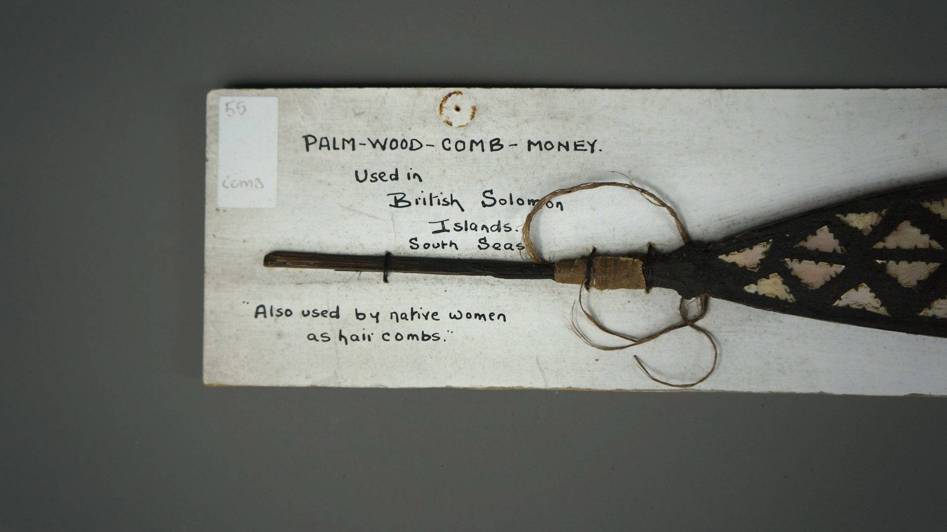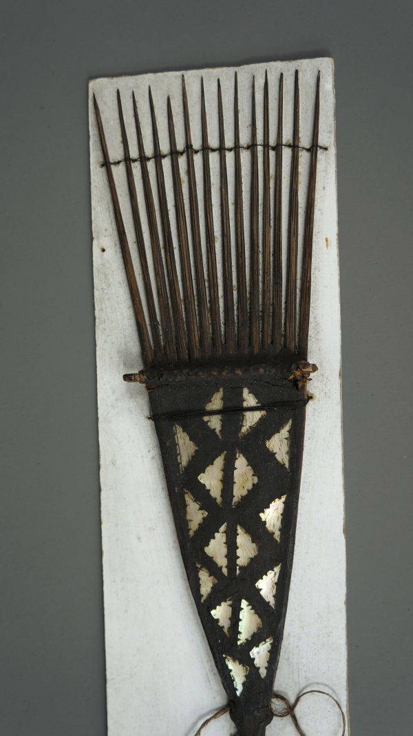 179. A large Solomon Islands comb inlaid with shell and mounted on a card. Early 20th/19th century.