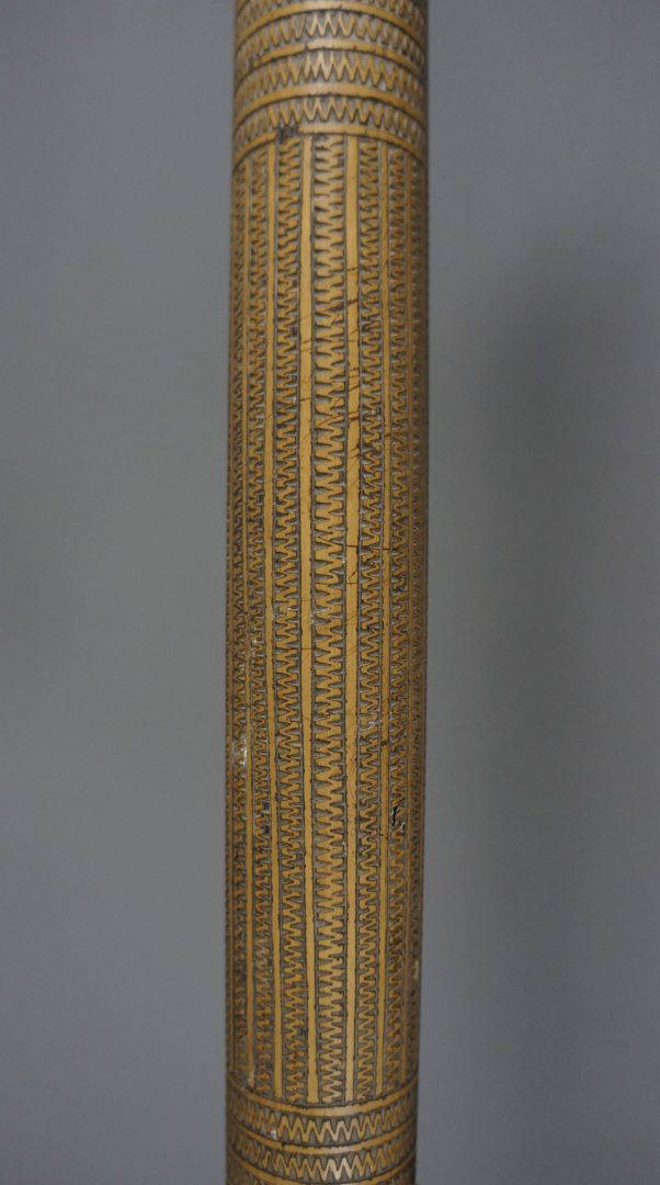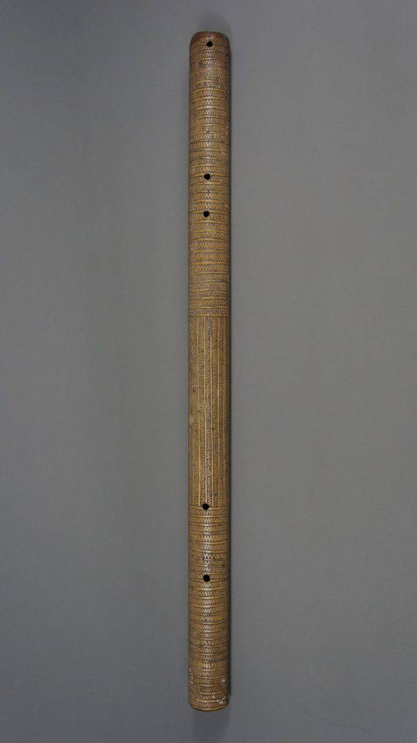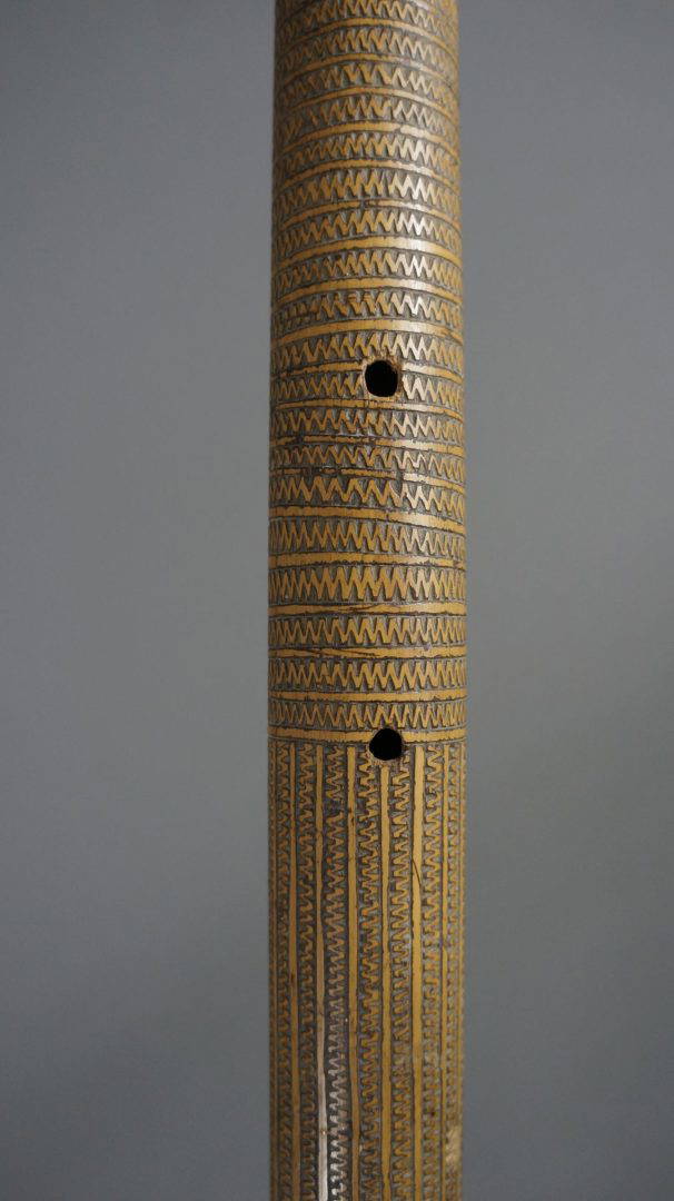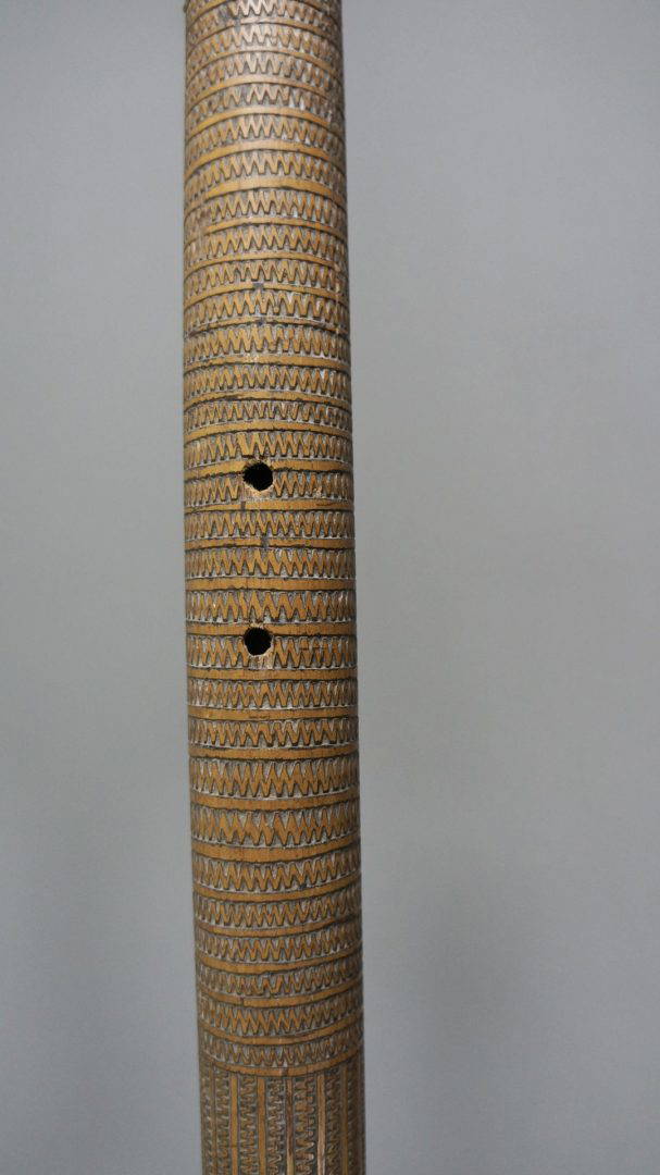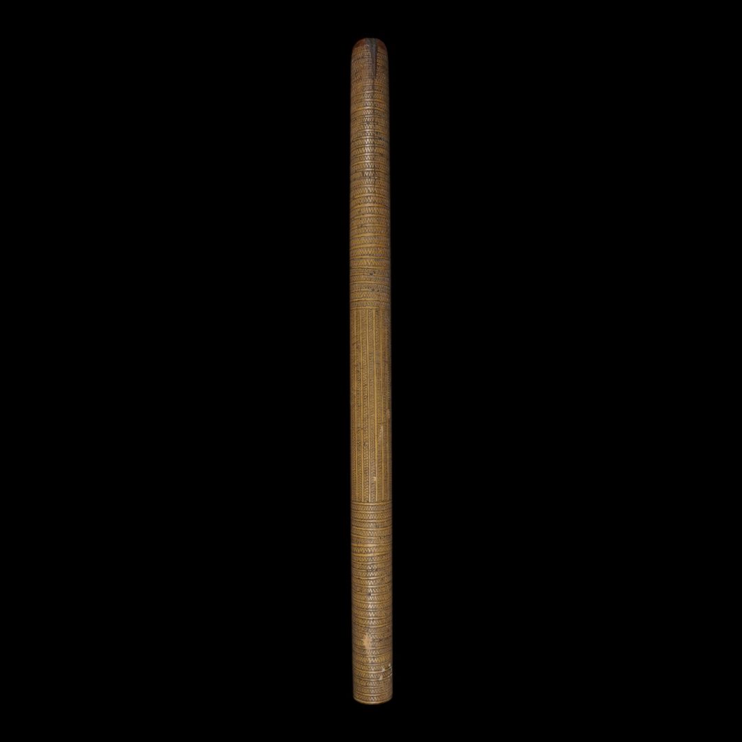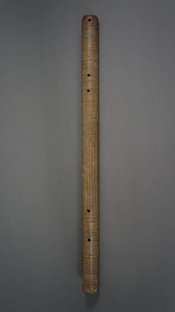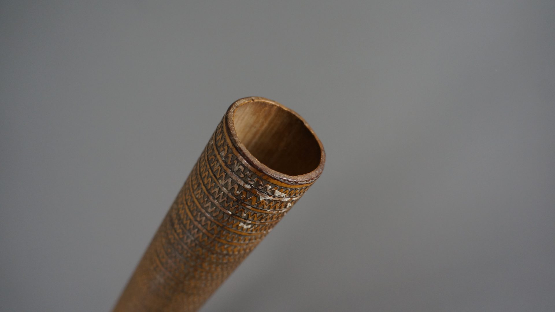 A rare bamboo flute beautifully carved with ‘Tavatava’ style carving over the entire surface. This nose flute may have doubled as a stamping tube as an example in the British Museum has very similar designs and is the same length. Museum number Oc1913,0524.62