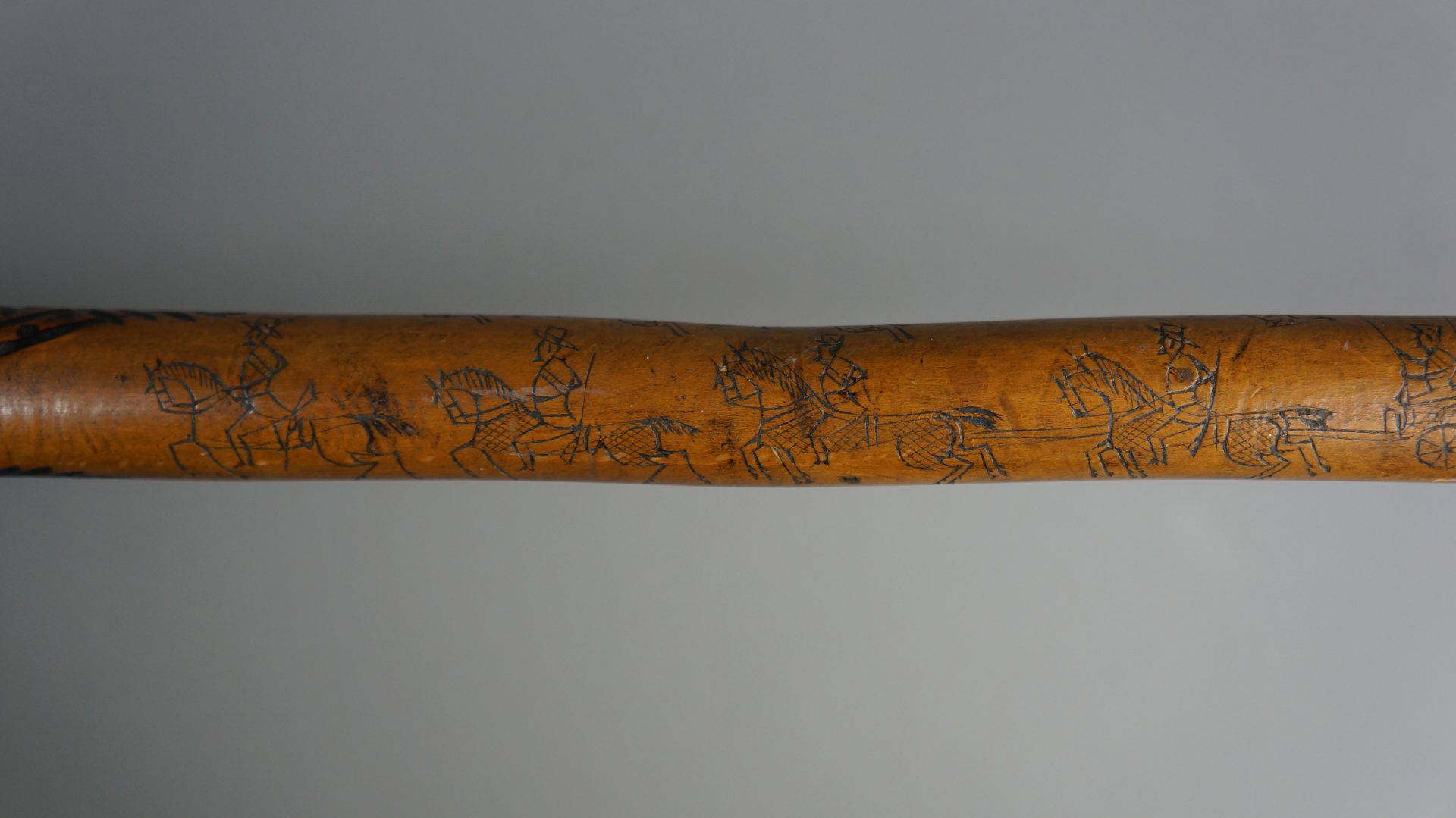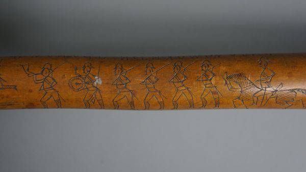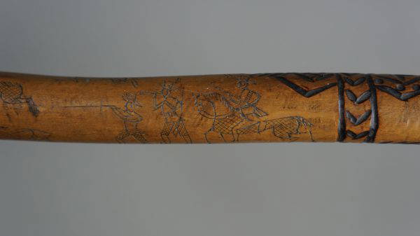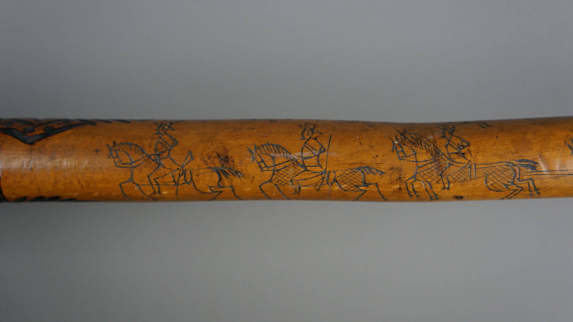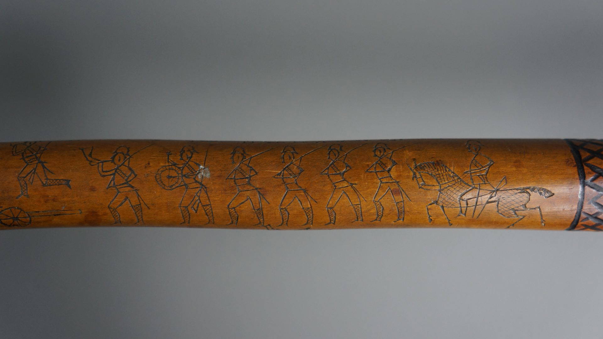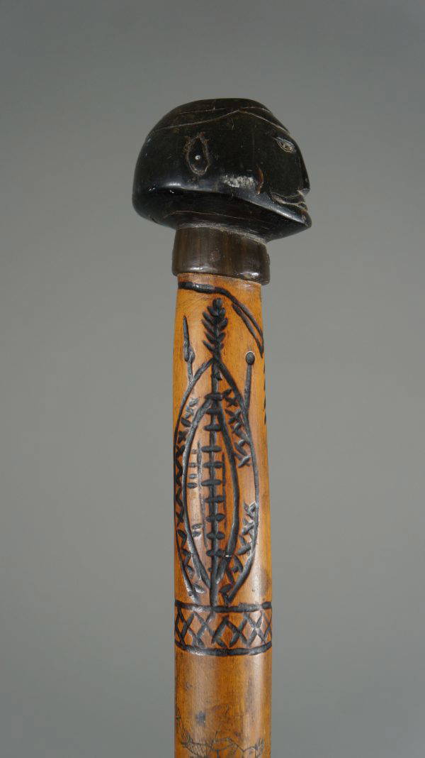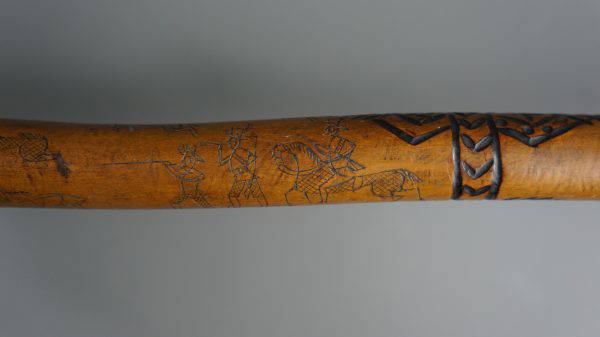 97. Dated 1912 and inscribed ‘3/C JA NEMOKE DE THABANCHU’ Thaba Nchu is also known as Blesberg, which is a town in South Africa. The shaft is covered in very skilfully engraved scenes of a military band, a lion attacking a native, a group of charging Zulus, Boers, artillery etc. The finial is carved as a soldiers head in horn. There is a pyrographic depiction of a Zulu shield. The combination of pyrography and fine engraving may indicate that the artist was a bushman as they are well known to have incorporated both techniques when decorating staffs and sticks.