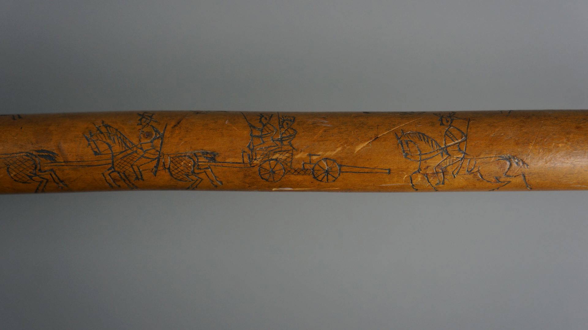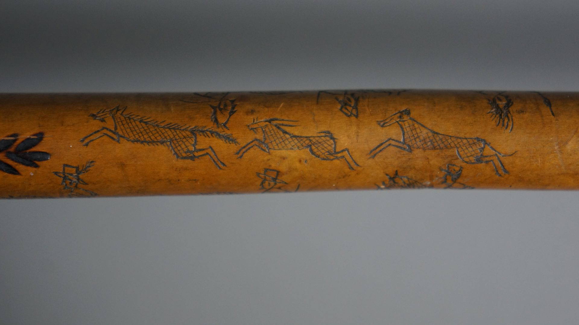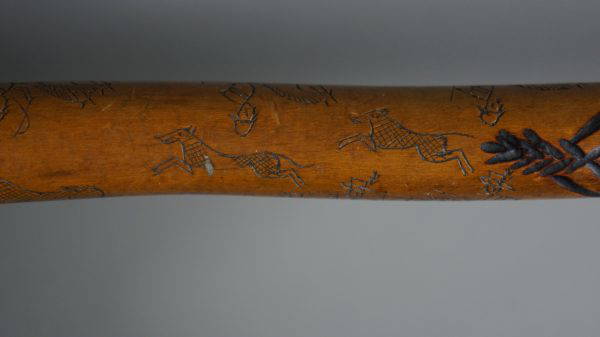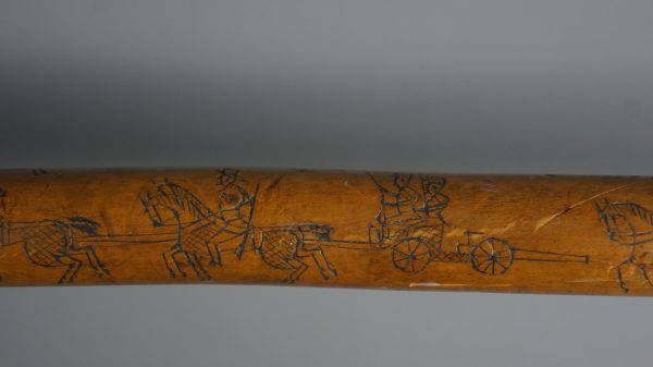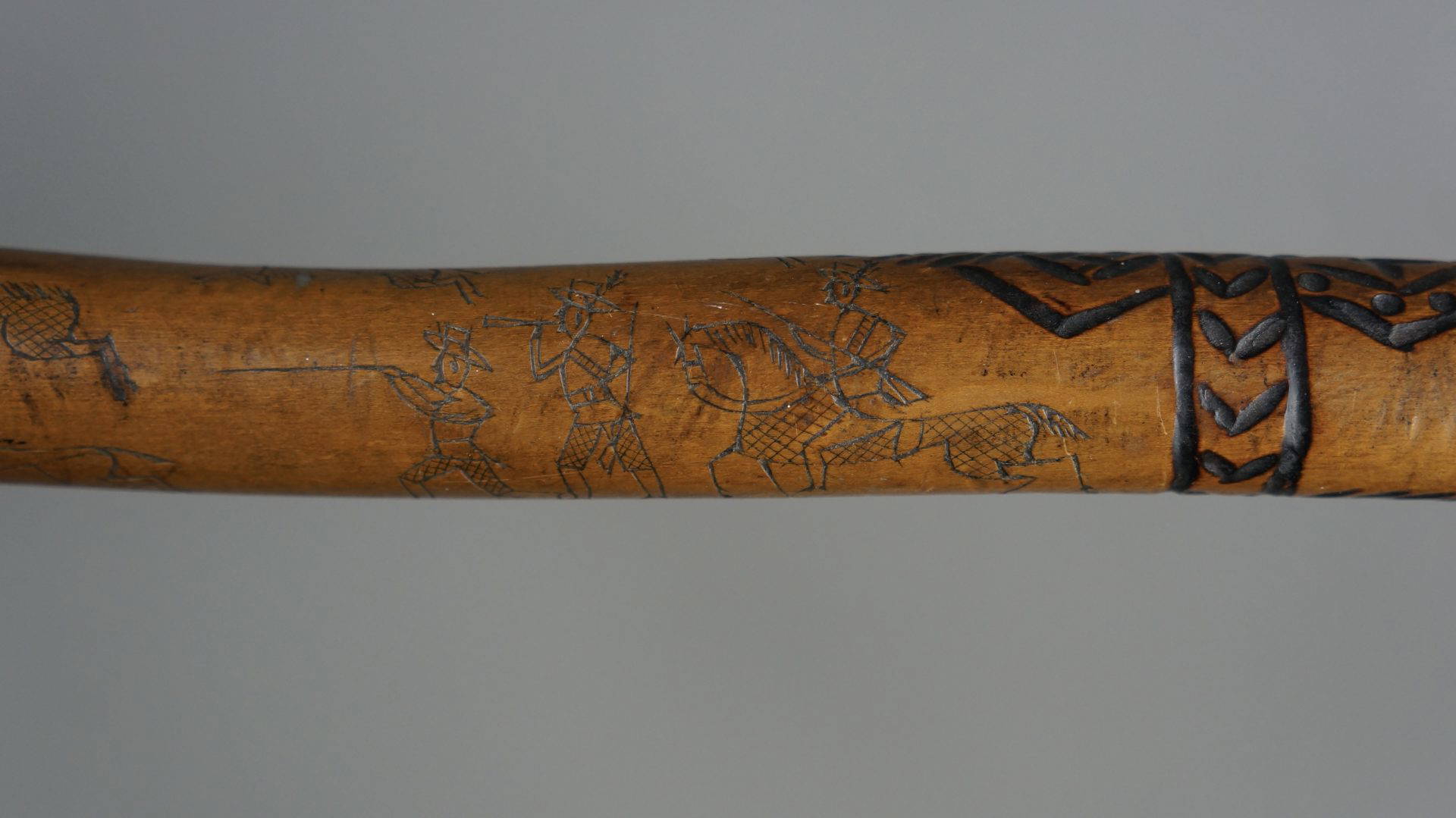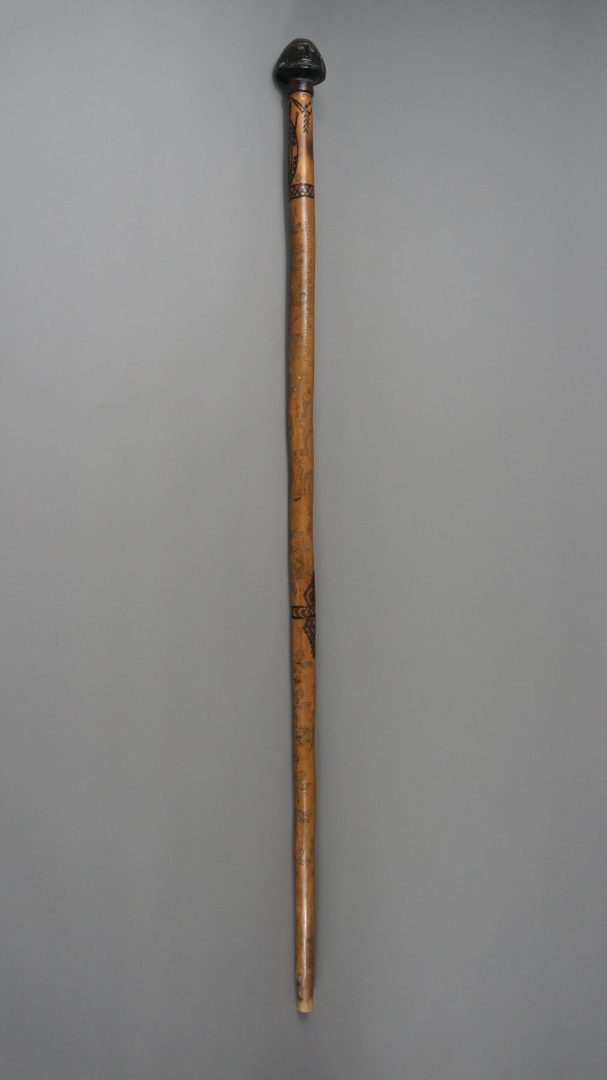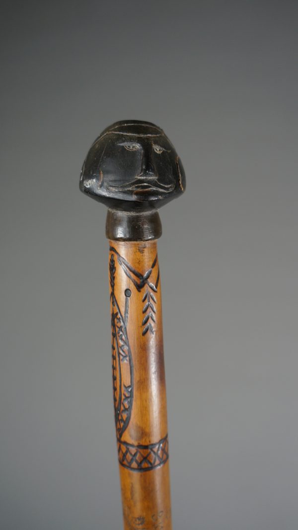 97. Dated 1912 and inscribed ‘3/C JA NEMOKE DE THABANCHU’ Thaba Nchu is also known as Blesberg, which is a town in South Africa. The shaft is covered in very skilfully engraved scenes of a military band, a lion attacking a native, a group of charging Zulus, Boers, artillery etc. The finial is carved as a soldiers head in horn. There is a pyrographic depiction of a Zulu shield. The combination of pyrography and fine engraving may indicate that the artist was a bushman as they are well known to have incorporated both techniques when decorating staffs and sticks.