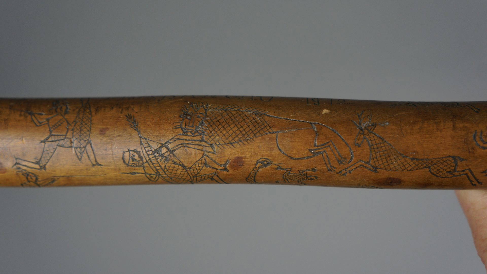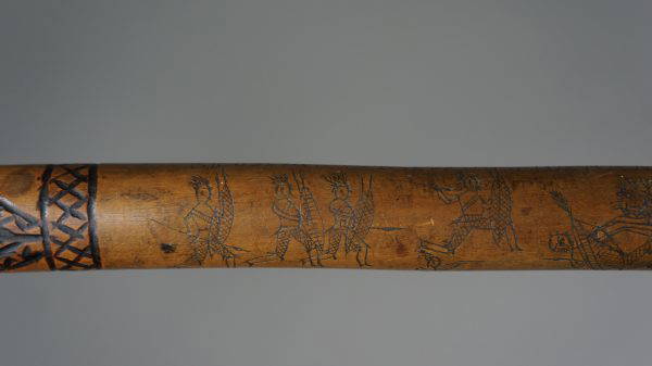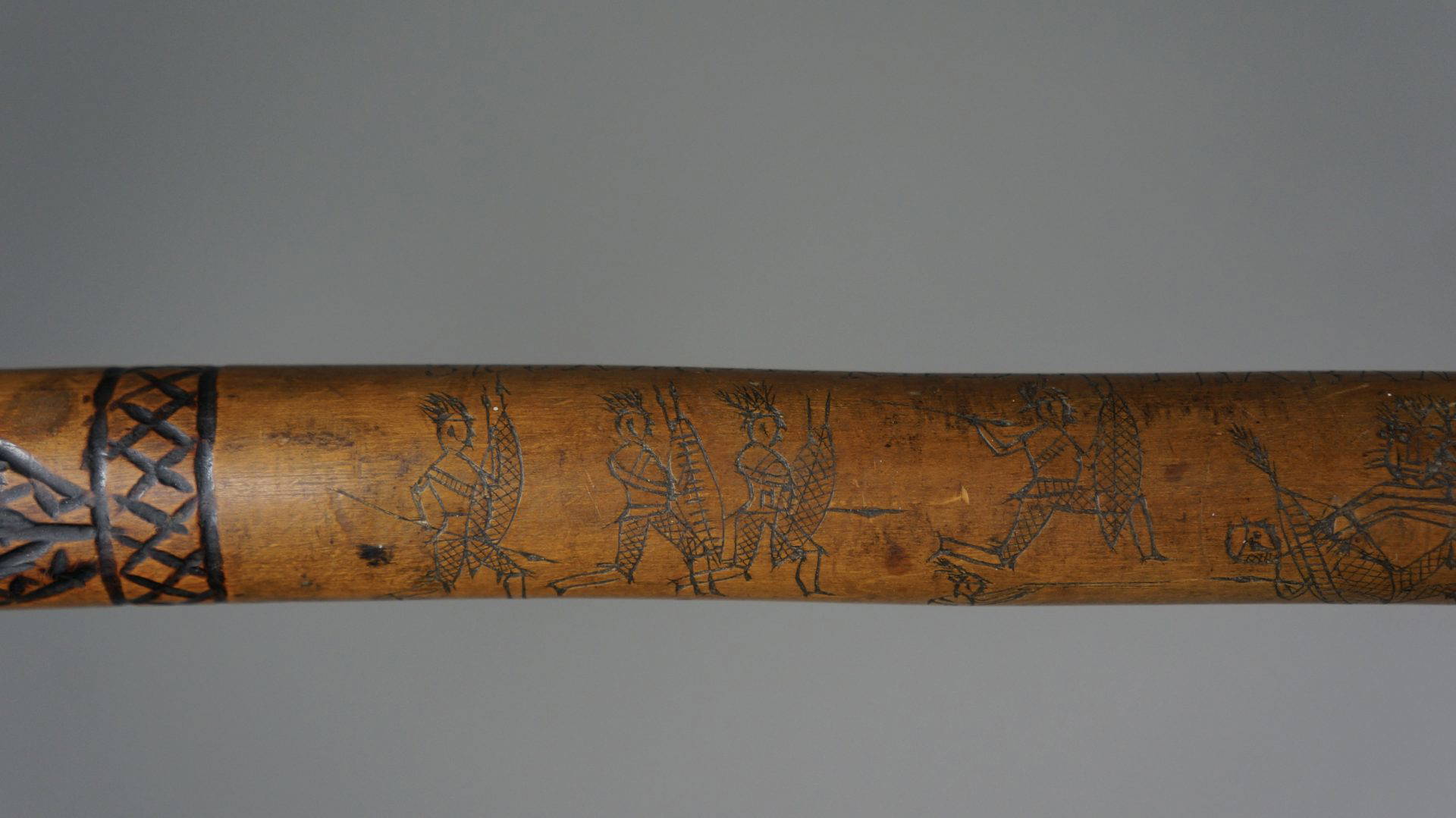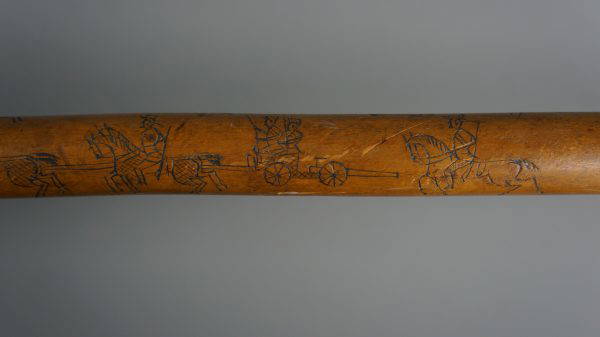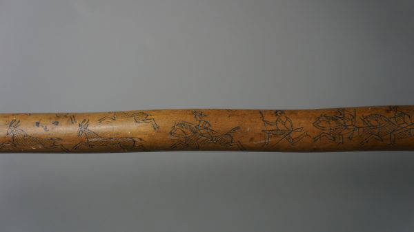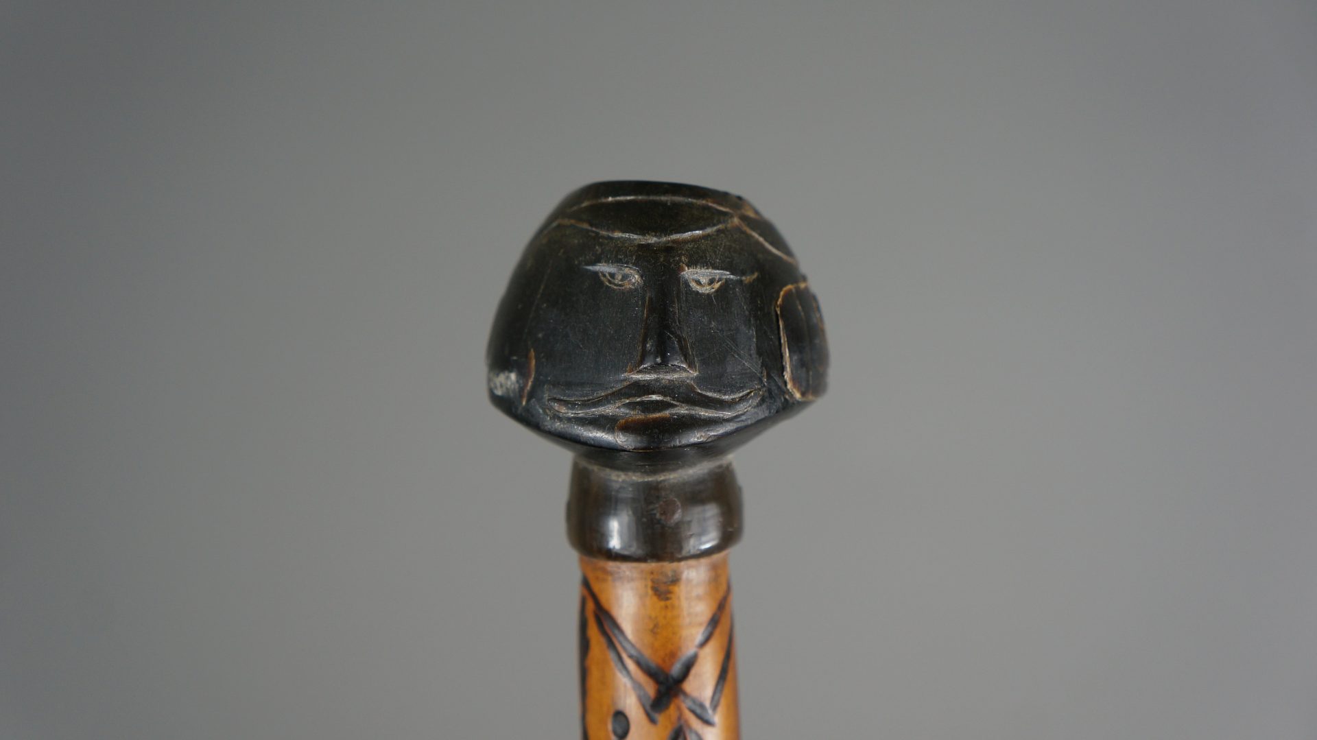 97. Dated 1912 and inscribed ‘3/C JA NEMOKE DE THABANCHU’ Thaba Nchu is also known as Blesberg, which is a town in South Africa. The shaft is covered in very skilfully engraved scenes of a military band, a lion attacking a native, a group of charging Zulus, Boers, artillery etc. The finial is carved as a soldiers head in horn. There is a pyrographic depiction of a Zulu shield. The combination of pyrography and fine engraving may indicate that the artist was a bushman as they are well known to have incorporated both techniques when decorating staffs and sticks.