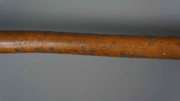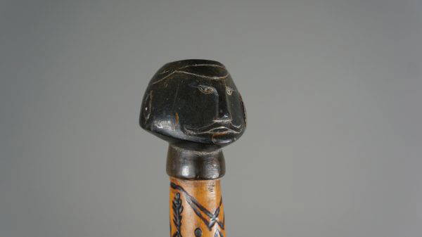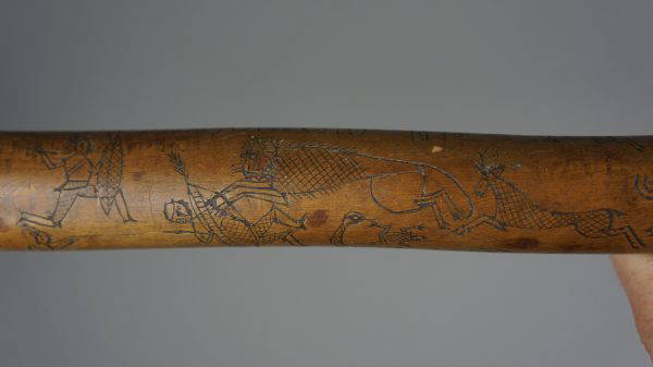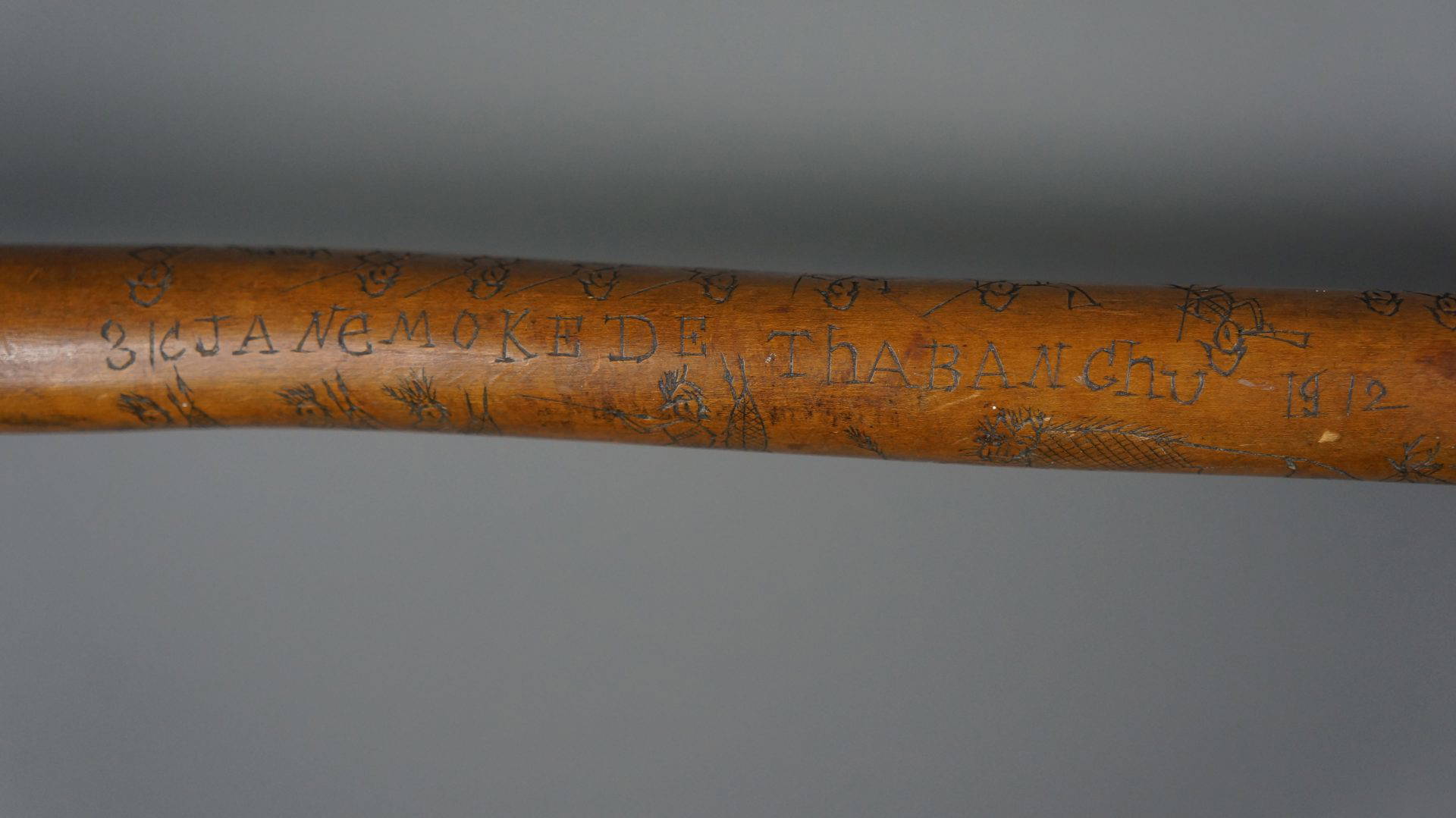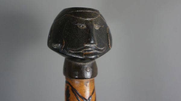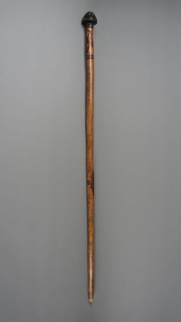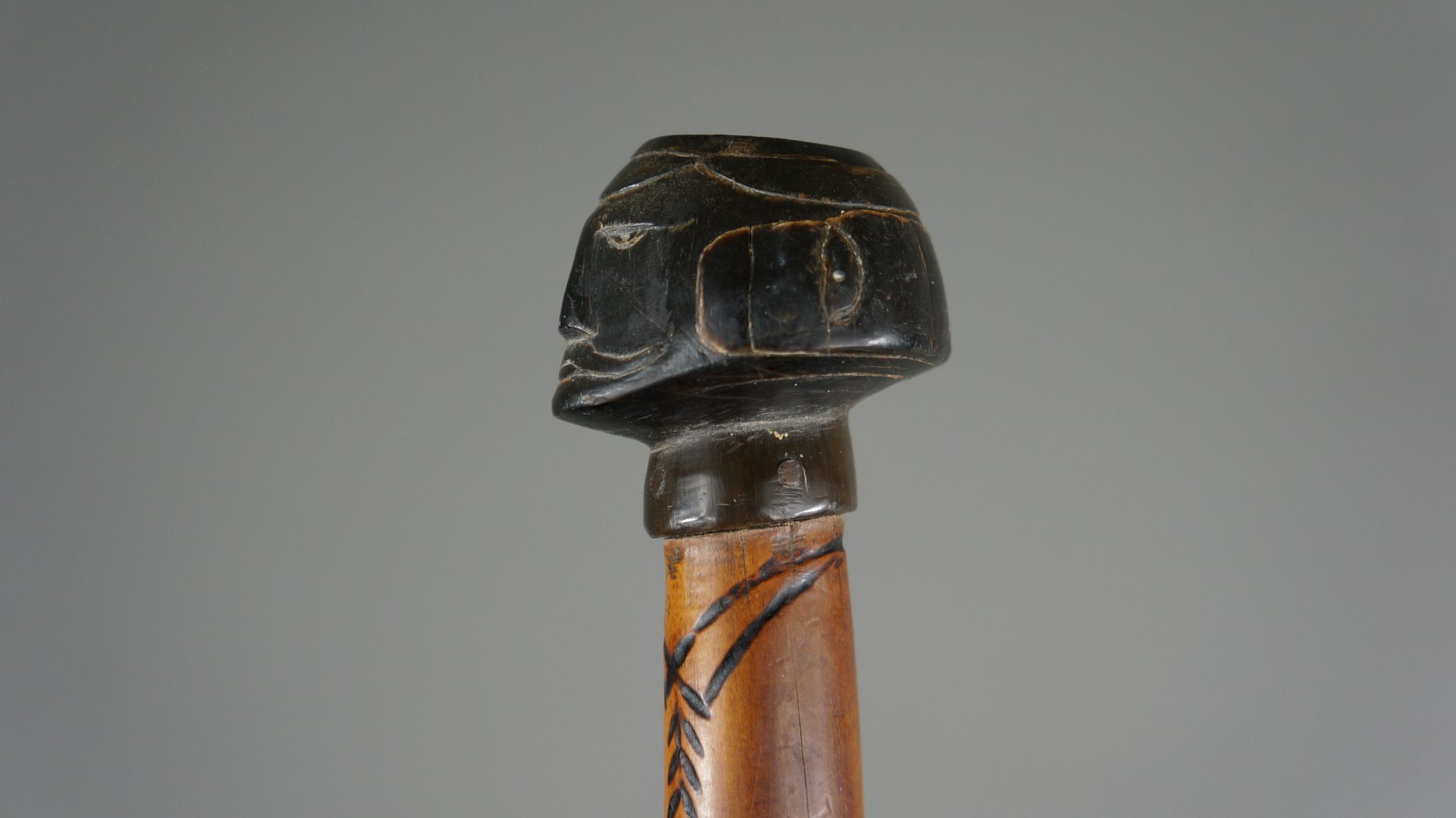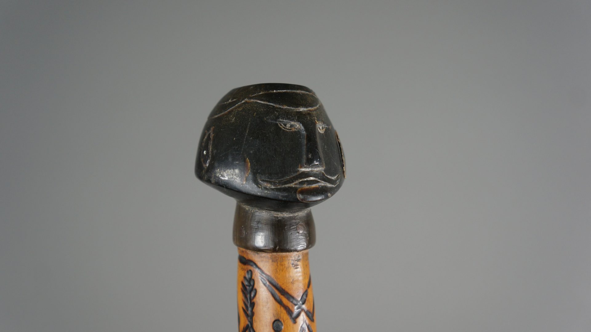 97. Dated 1912 and inscribed ‘3/C JA NEMOKE DE THABANCHU’ Thaba Nchu is also known as Blesberg, which is a town in South Africa. The shaft is covered in very skilfully engraved scenes of a military band, a lion attacking a native, a group of charging Zulus, Boers, artillery etc. The finial is carved as a soldiers head in horn. There is a pyrographic depiction of a Zulu shield. The combination of pyrography and fine engraving may indicate that the artist was a bushman as they are well known to have incorporated both techniques when decorating staffs and sticks.