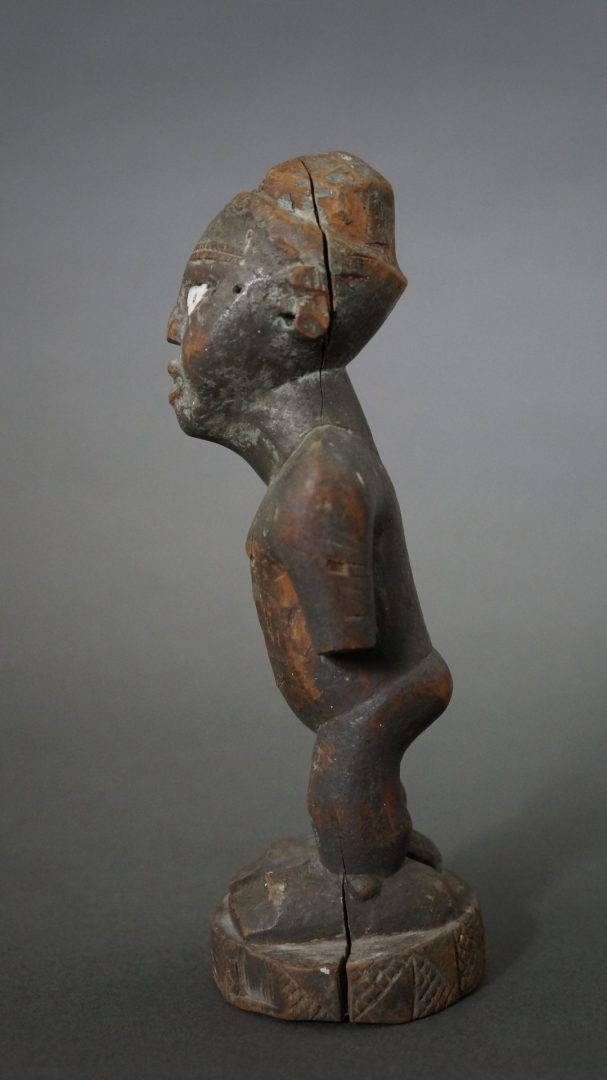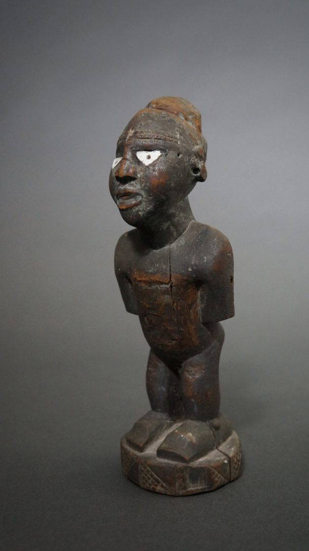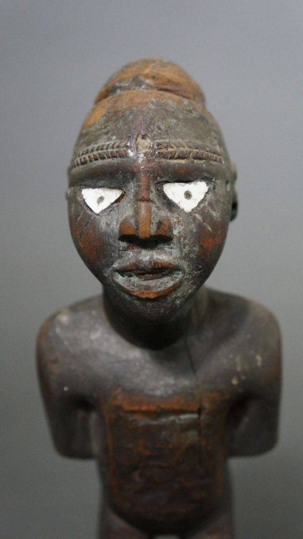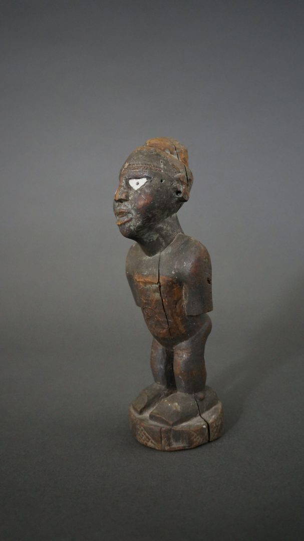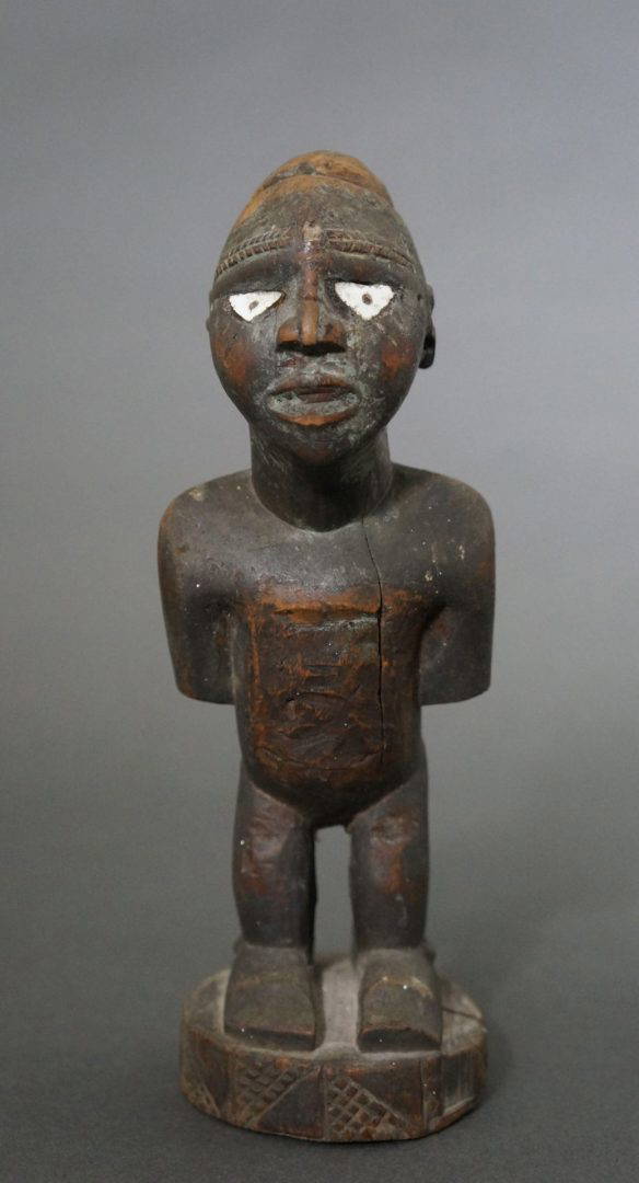 216. A small 19th century figure with ceramic eyes. This figure would have once had a magical charge attached to the head.