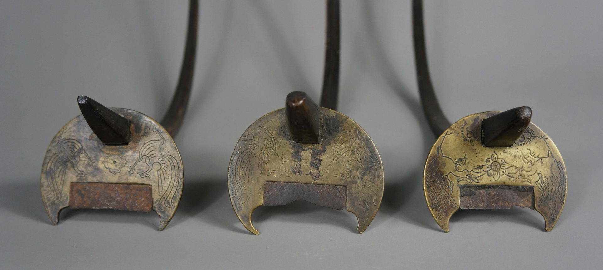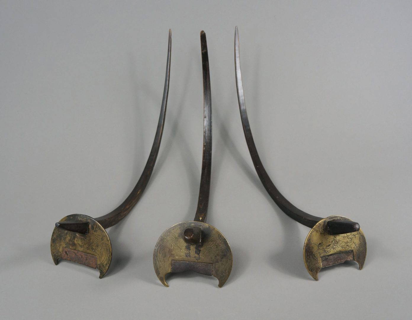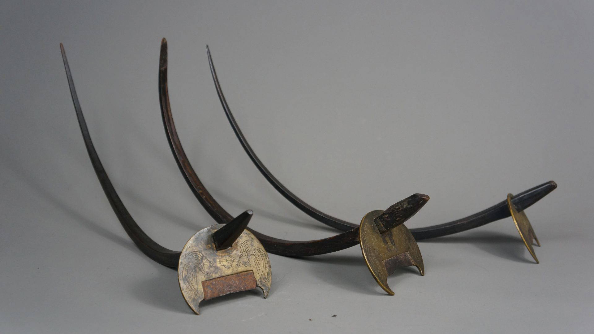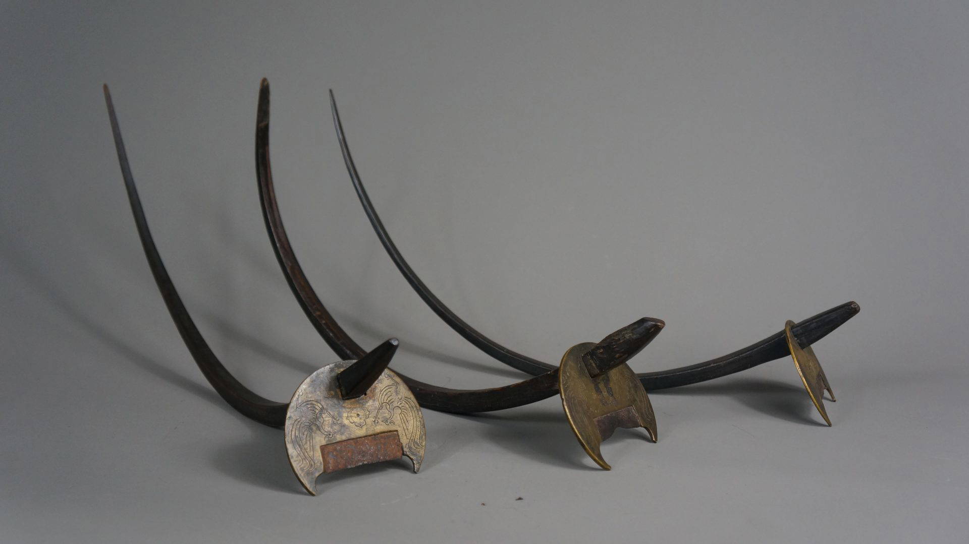 A group of rice cutters (Zhai he dao) c1900. Buffalo horn, brass and iron blades.