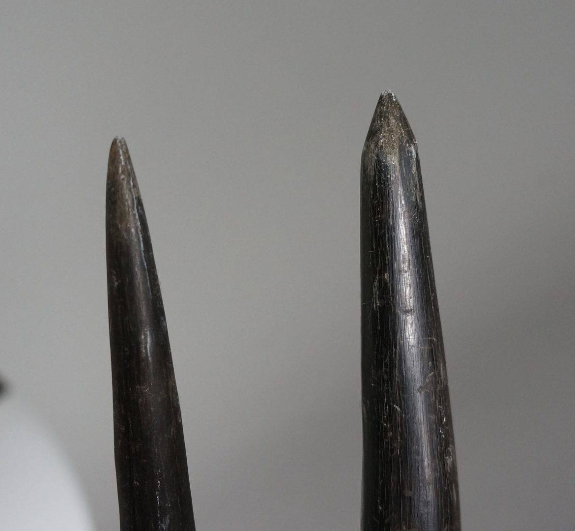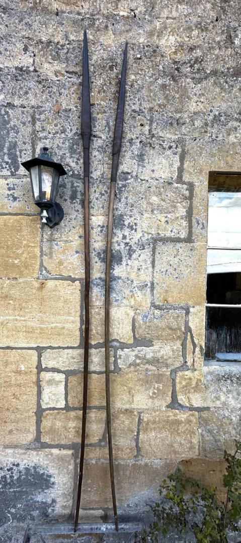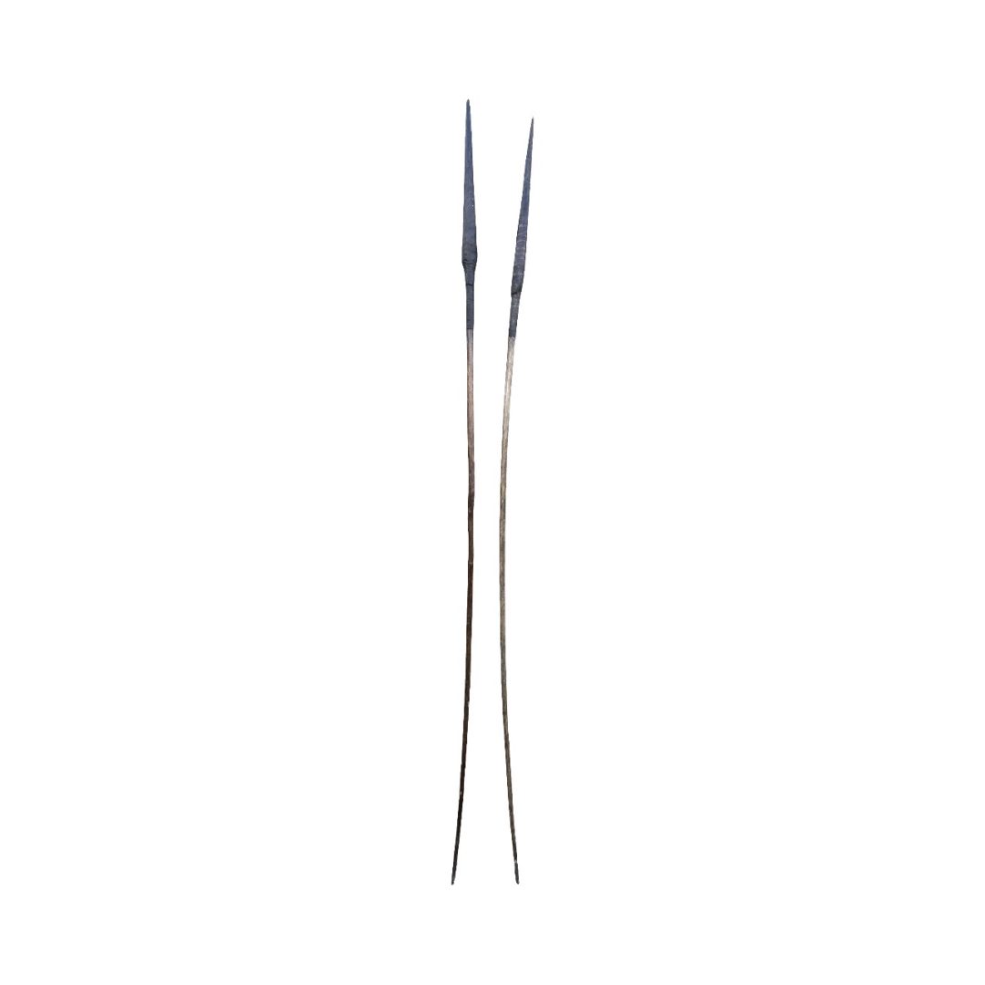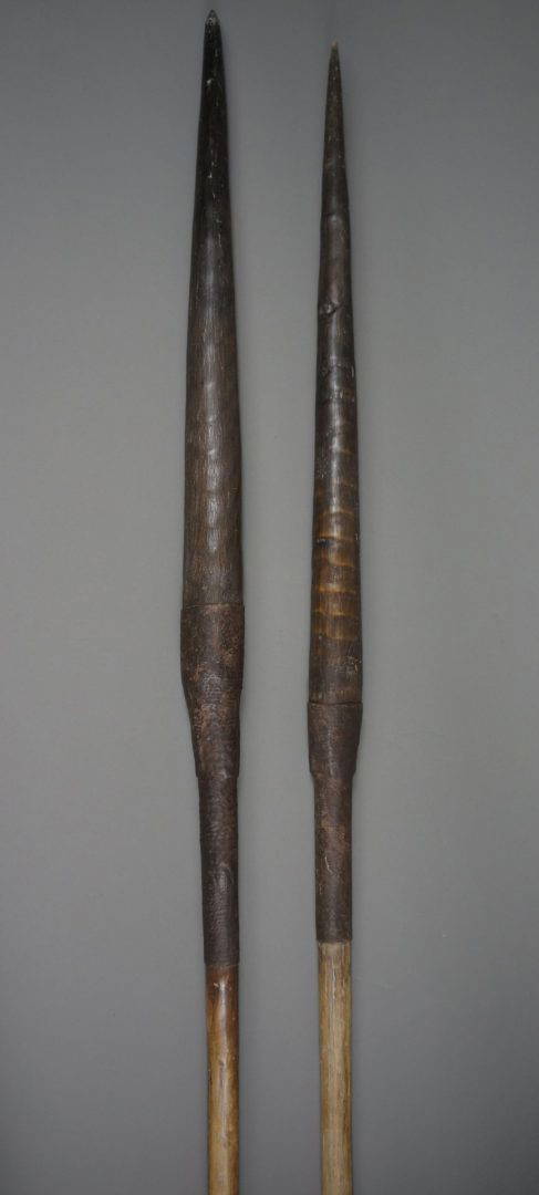 164. The heads of these rare spears are made from the complete horn of an antelope, most likely an oryx. These were found amongst the Dinka, Nuer and Shilluk. In order to create a very sturdy and robust binding, the horn has been attached to the wooden spear shaft using seamless hide from the tail that has been moistened and shrunk onto the join. There are several examples in the collections of the Pitt Rivers, a quantity being collected amongst the Nuer by Edward Evan Evans-Pritchard.