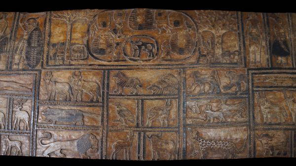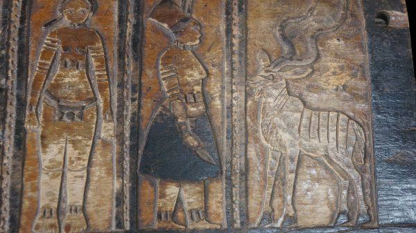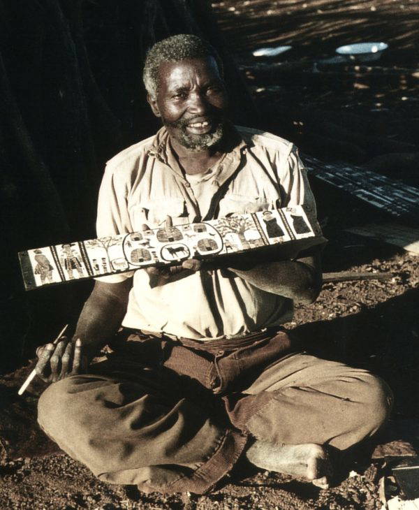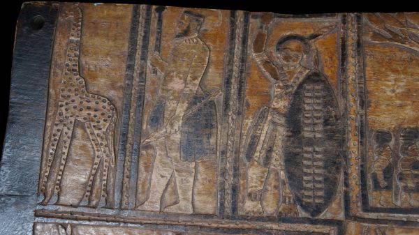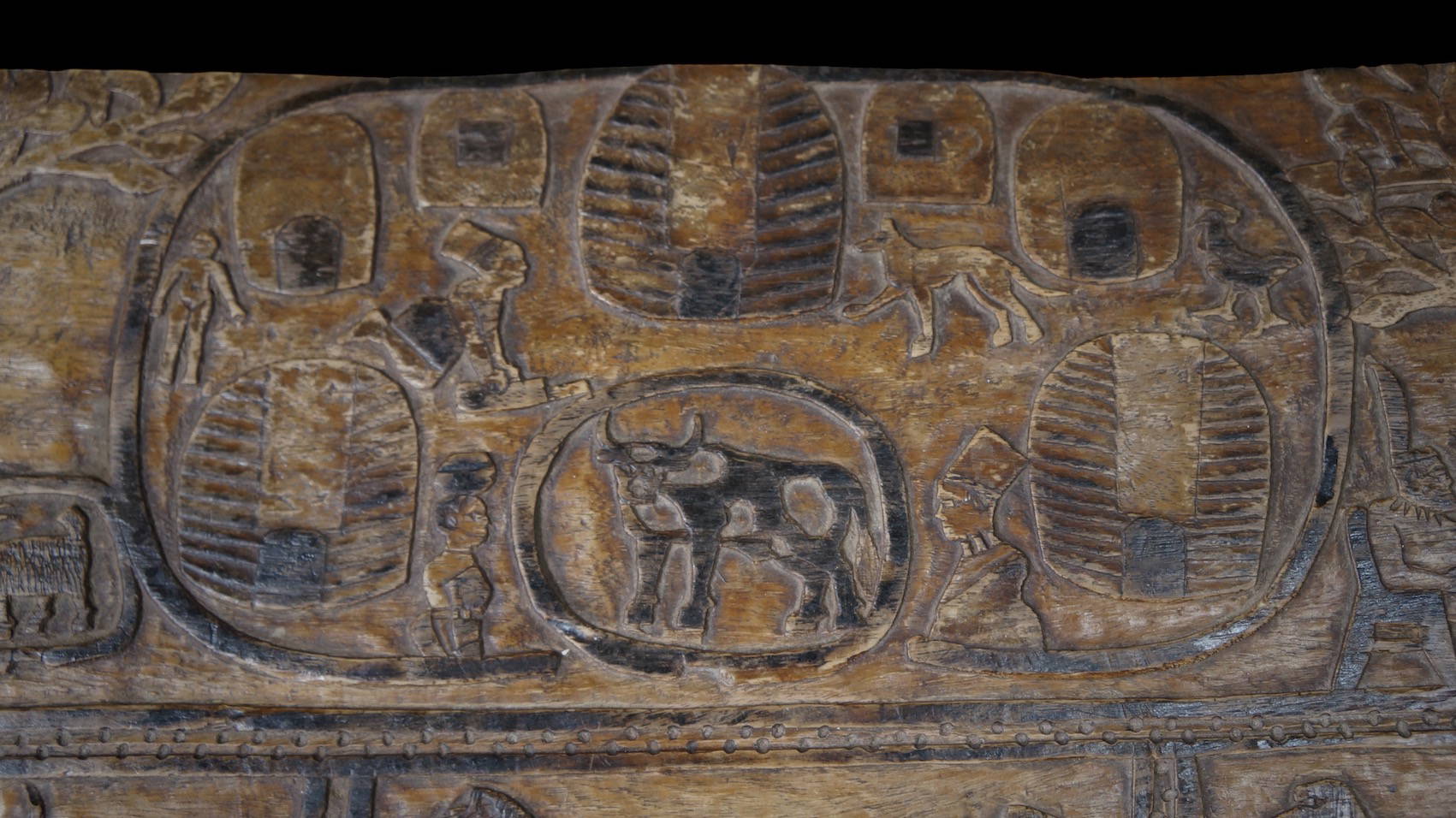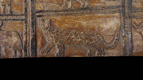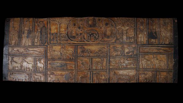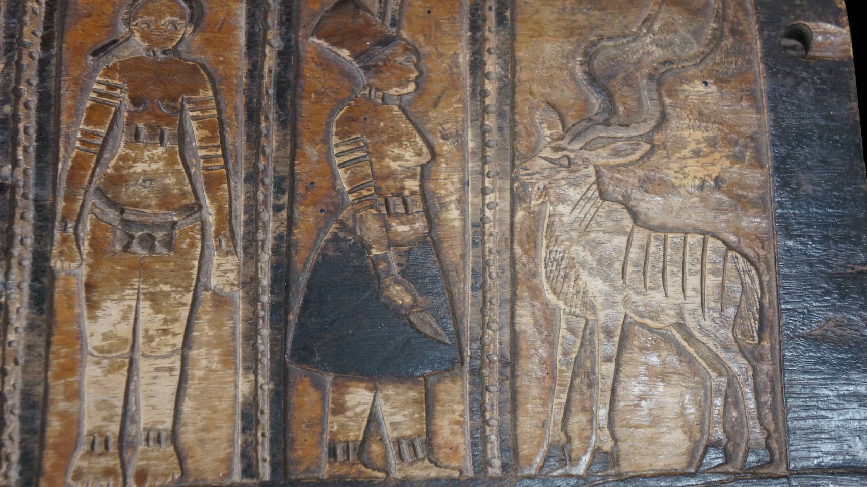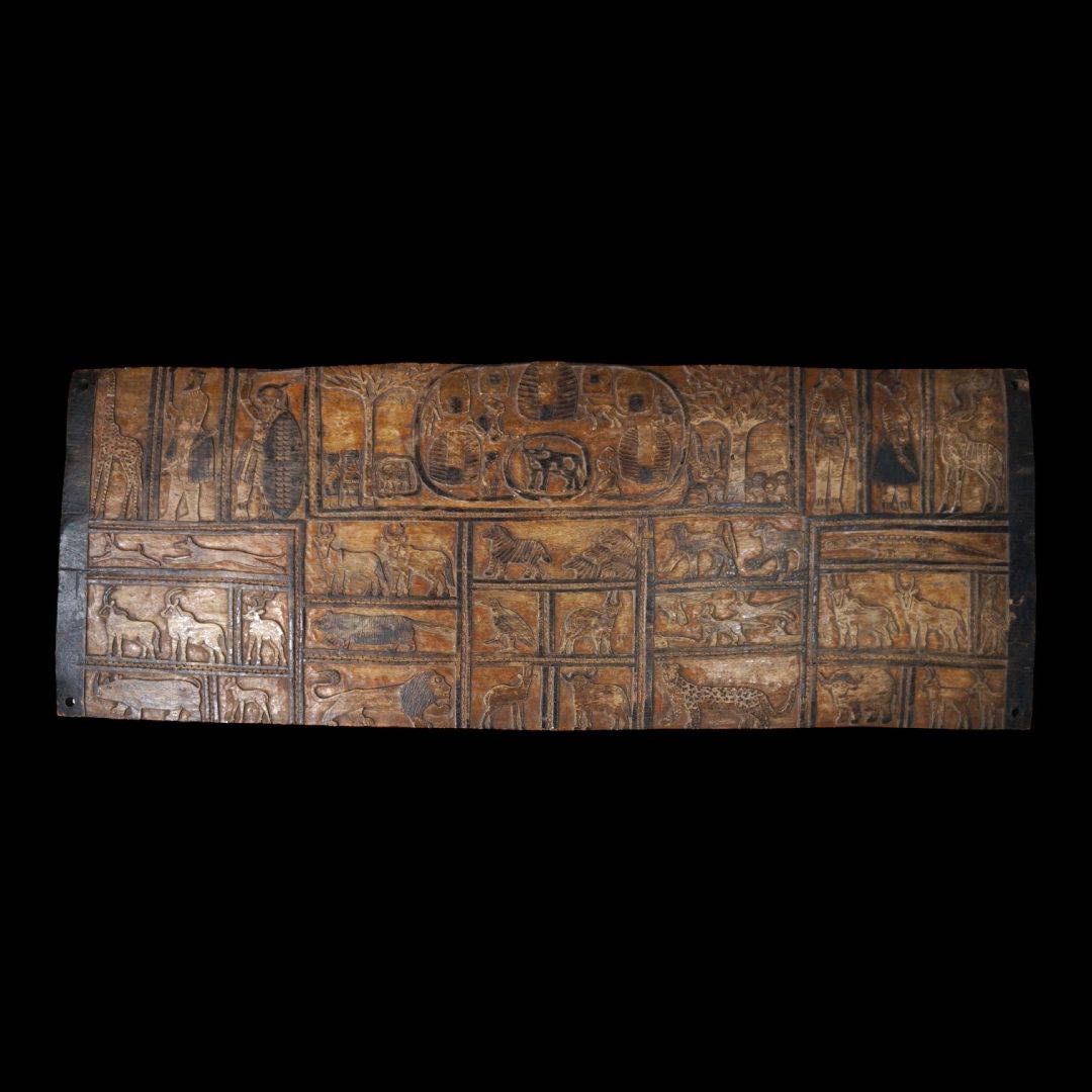 The decorated front panel of a rack umfanekiso used for storing basketry mats. Two panels by the same hand have been published, one in “Art And Ambiguity” and the other in “both valuable and curios” The panel offered here is larger and more complex than both of them. This panel is probably from the first half of Qwabe’s career, dating to the inter-war period.